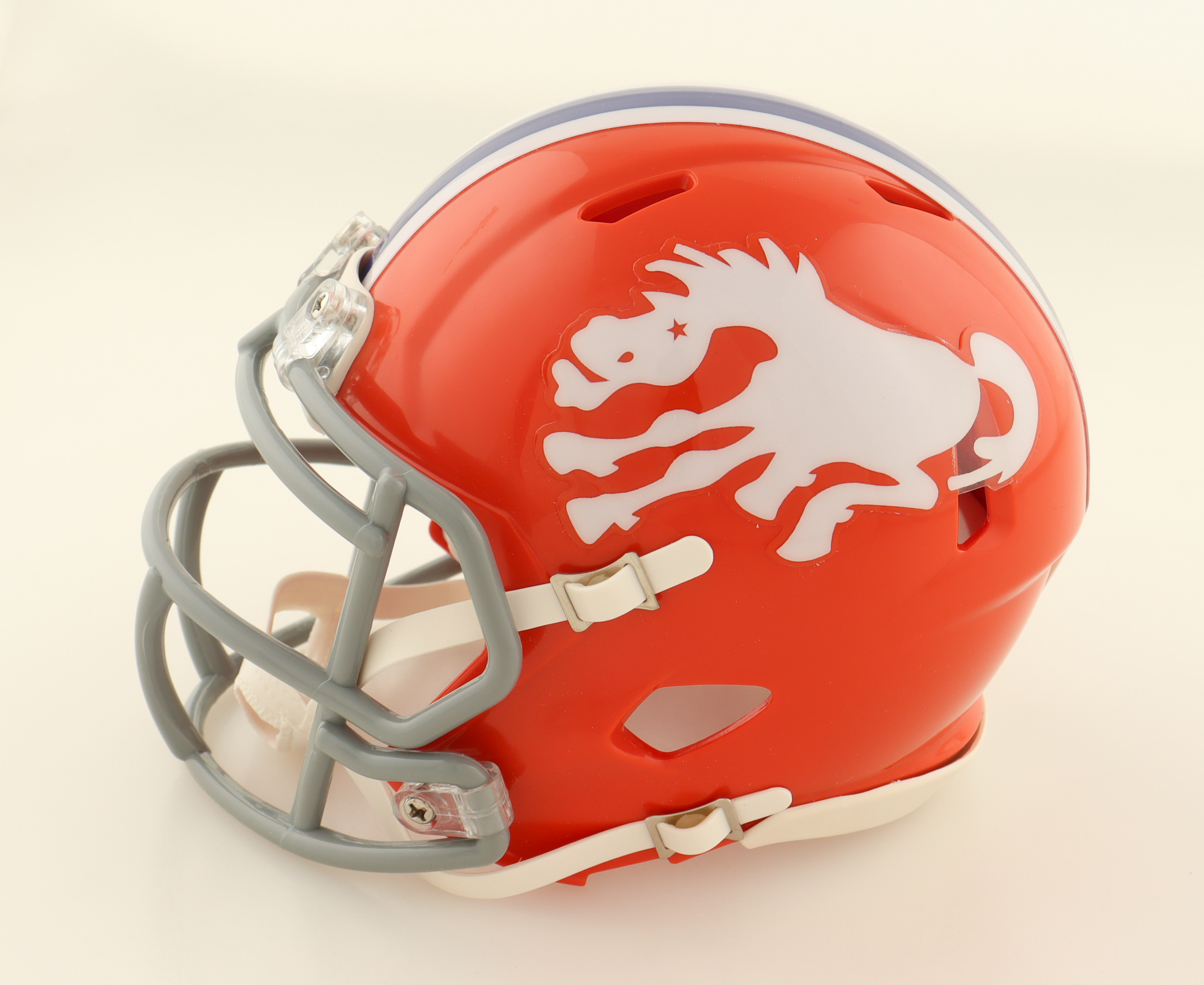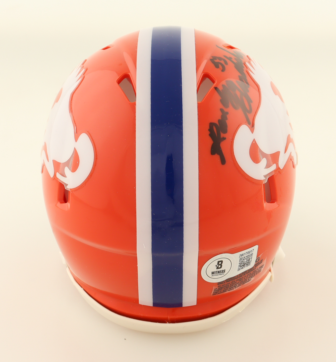 Riddell Denver Broncos Throwback Alternate Speed mini helmet. Hand-signed and inscribed by Randy Gradishar.