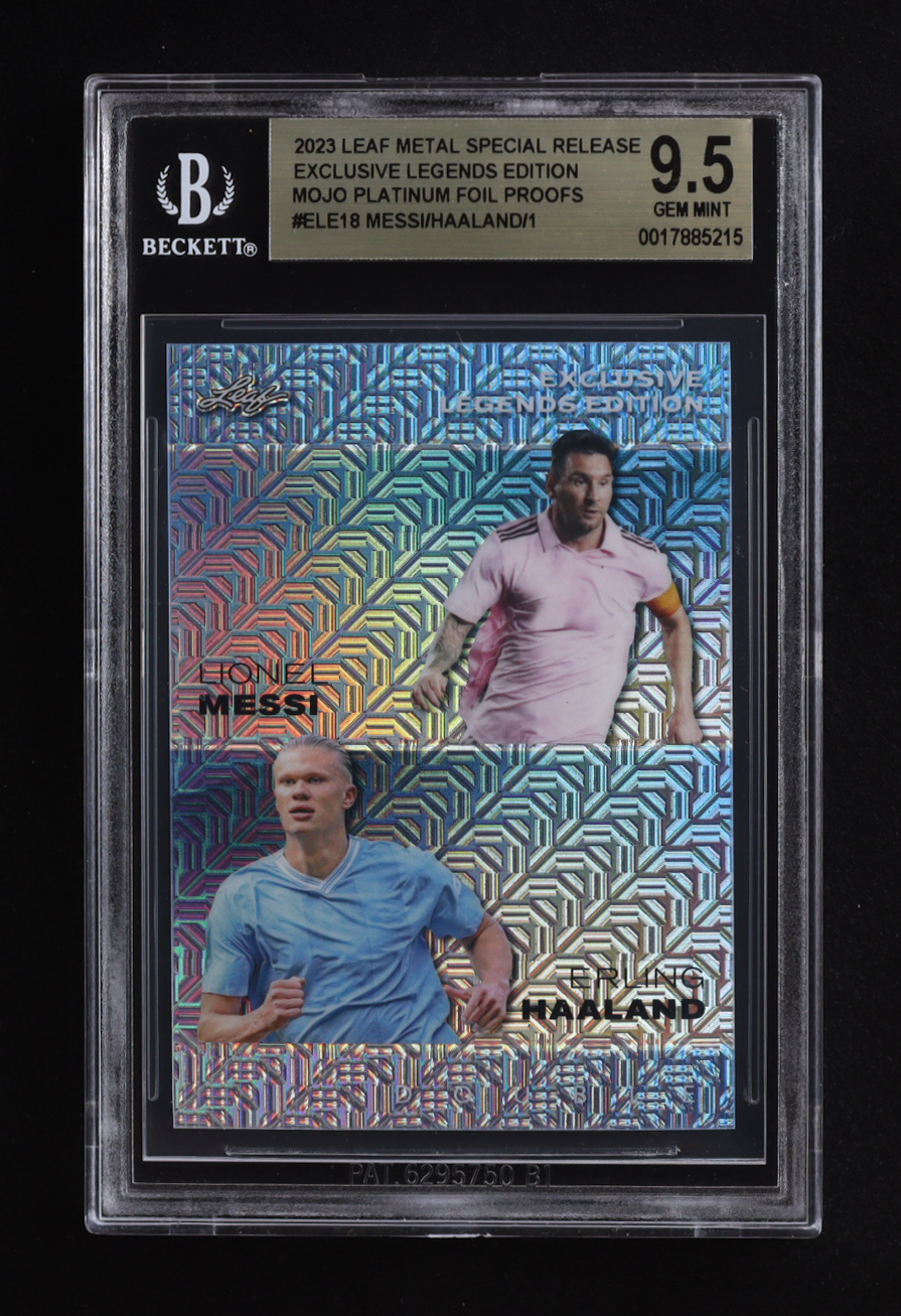Lionel Messi / Erling Haaland 2023 Leaf Metal Special Release Exclusive Legends Edition Mojo Platinum Foil Proofs #ELE18 #1/1 (BGS 9.5)