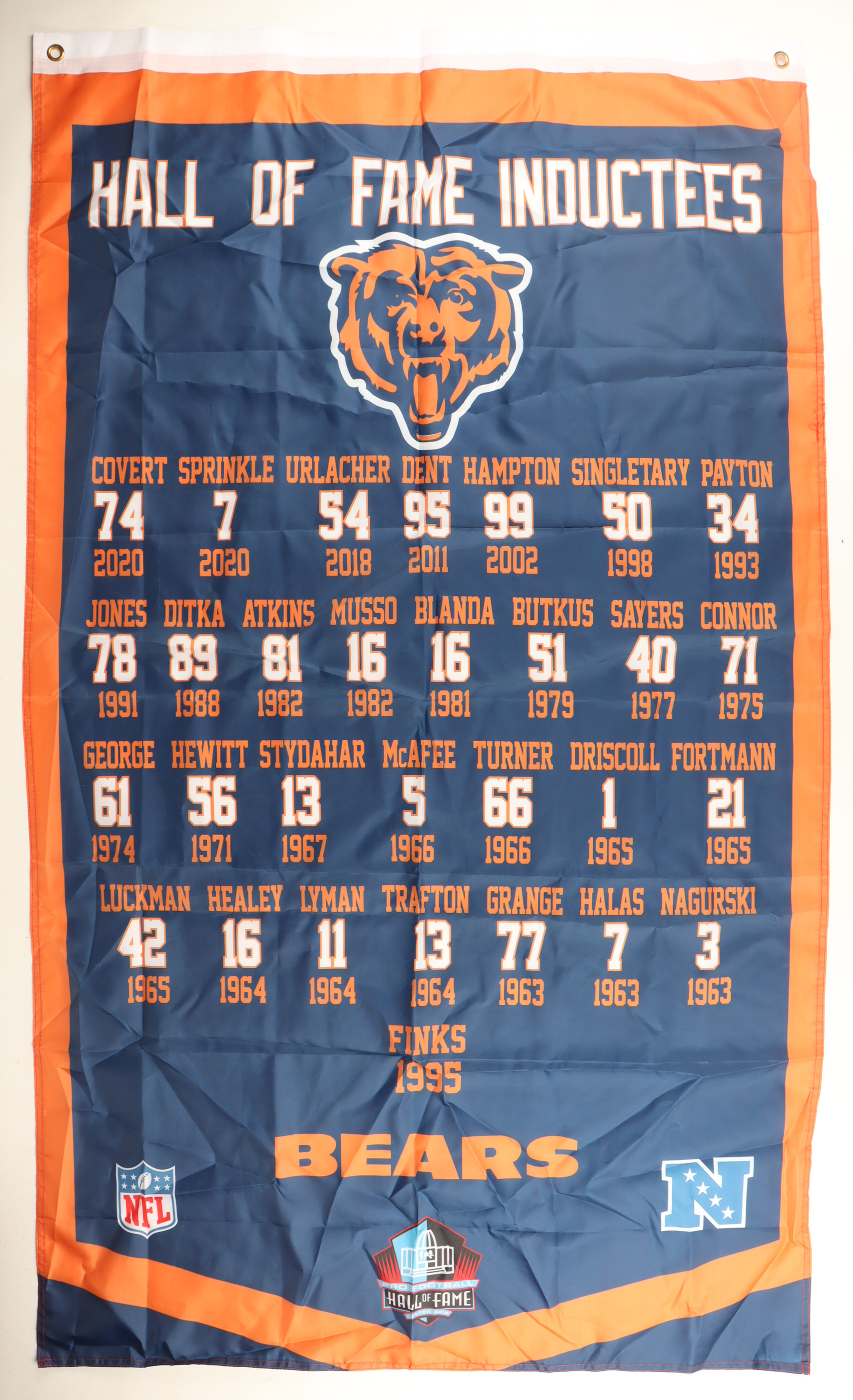 Chiacgo Bears Hall of Fame Inductees replica banner measures approximately 36" x 59" in size.