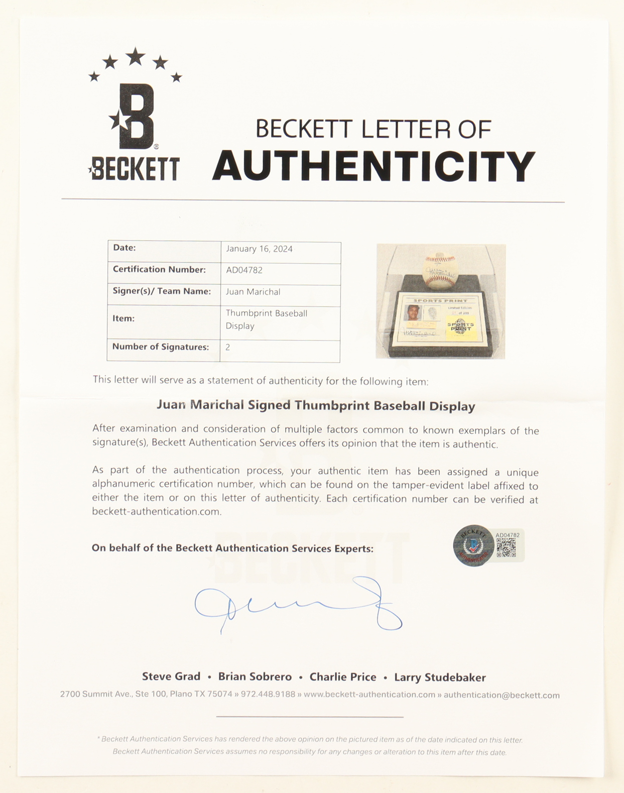 The autograph includes an official Beckett Authentication Services hologram and matching LOA for authenticity purposes.