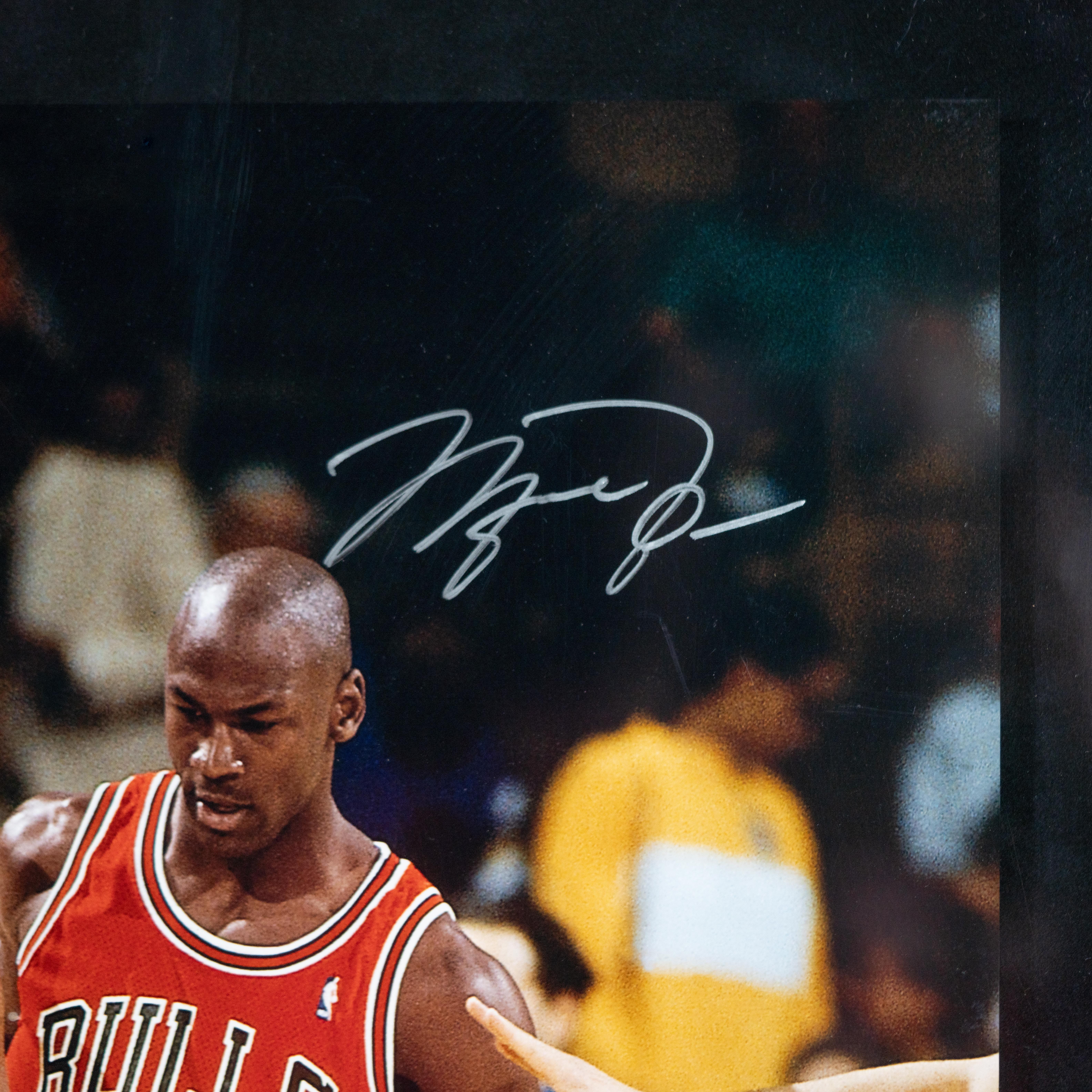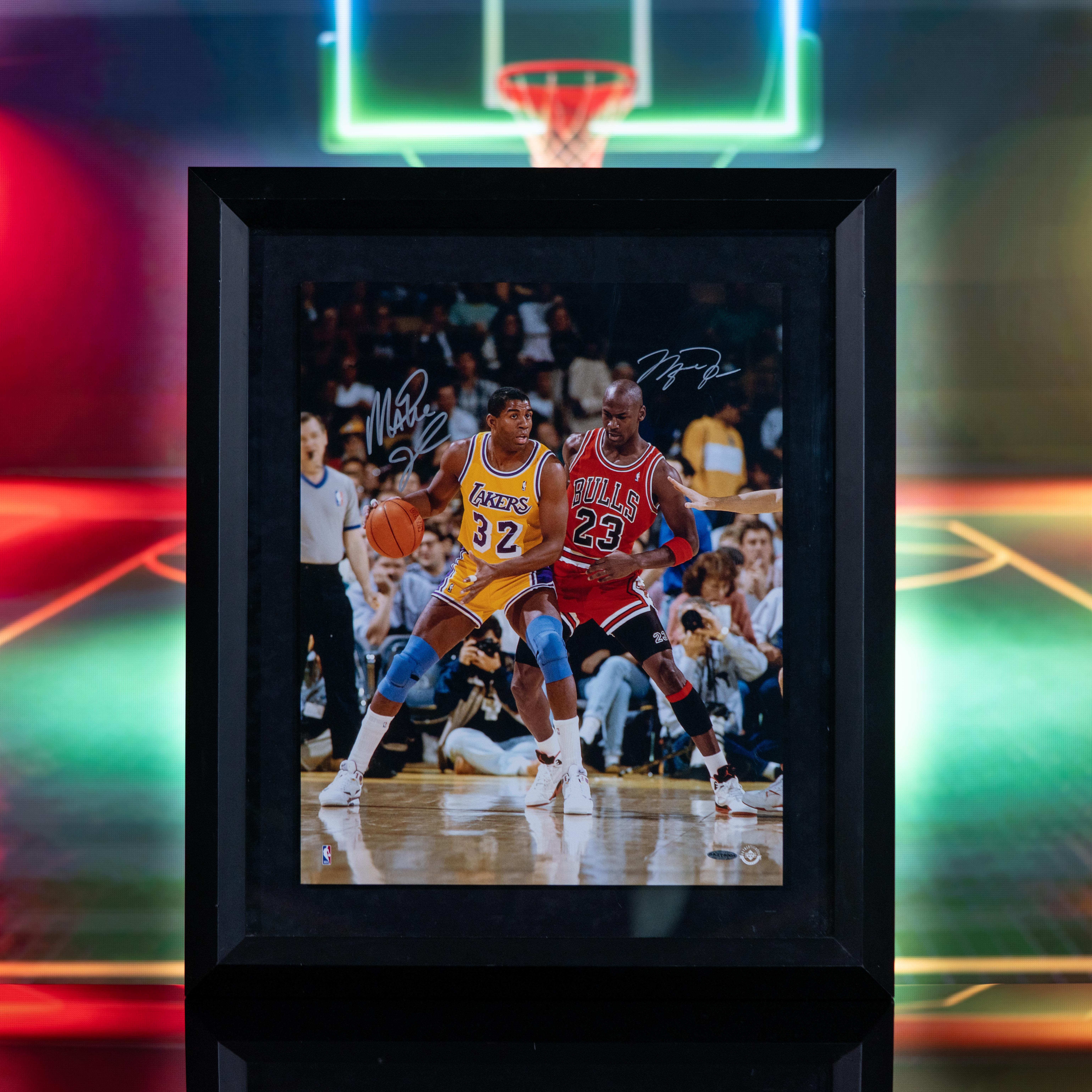 Custom frame measures 23” x 28” in size and features a photo that has been hand-signed by Michael Jordan (Chicago Bulls, HOF) and Magic Johnson (Los Angeles Lakers, HOF).