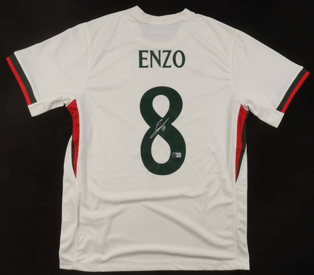 Nike jersey with everything pressed on, size L. Hand-signed by Enzo Fernandez (Chelsea F.C.).