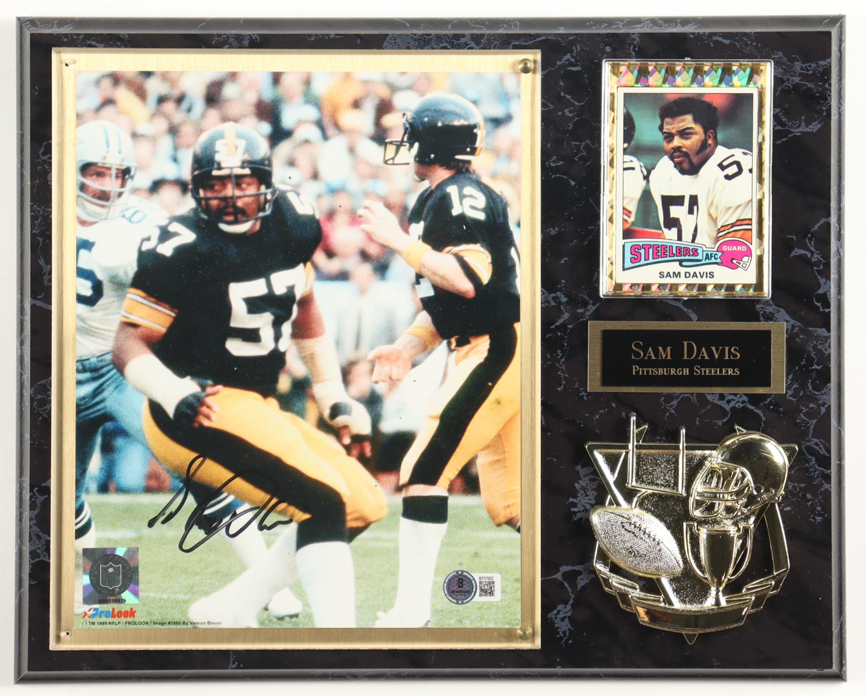 Custom plaque measures 12" x 15" in size. 8" x 10" photograph has been hand-signed by Sam Davis (Pittsburgh Steelers). Display also includes an unsigned trading card, a nameplate, and a plastic pin.