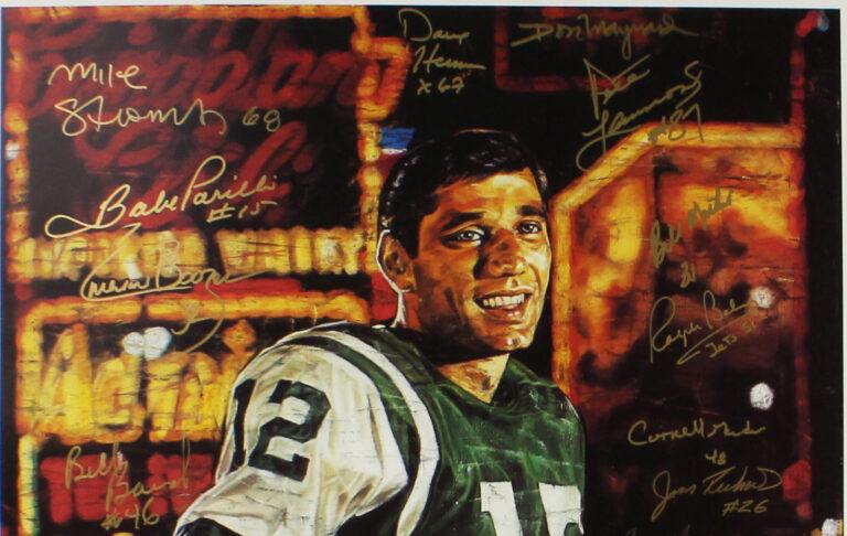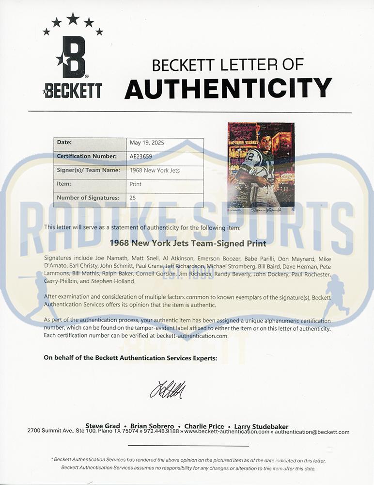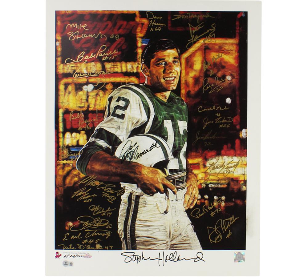 Poster measures 20” x 26” in size and has been hand-signed by (25) members of the 1969 New York Jets including Joe Namath, Don Maynard, Babe Parilli, Matt Snell, Emerson Boozer, Bill Mathis, Pete Lammons, Bill Baird, Dave Herman, Ralph Baker, Paul Rochester, Earl Christy, Al Atkinson, Mike D'Amato, John Schmidt, Paul Crane, Jeff Richardson, and (8) others.
