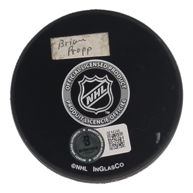 Philadelphia Flyers Logo Hockey Puck. Hand-signed and inscribed by Brian Propp.