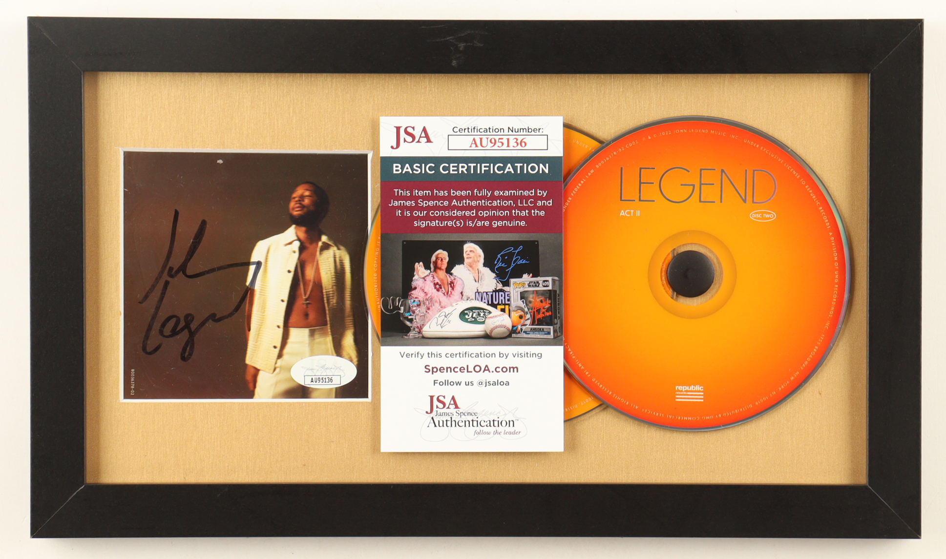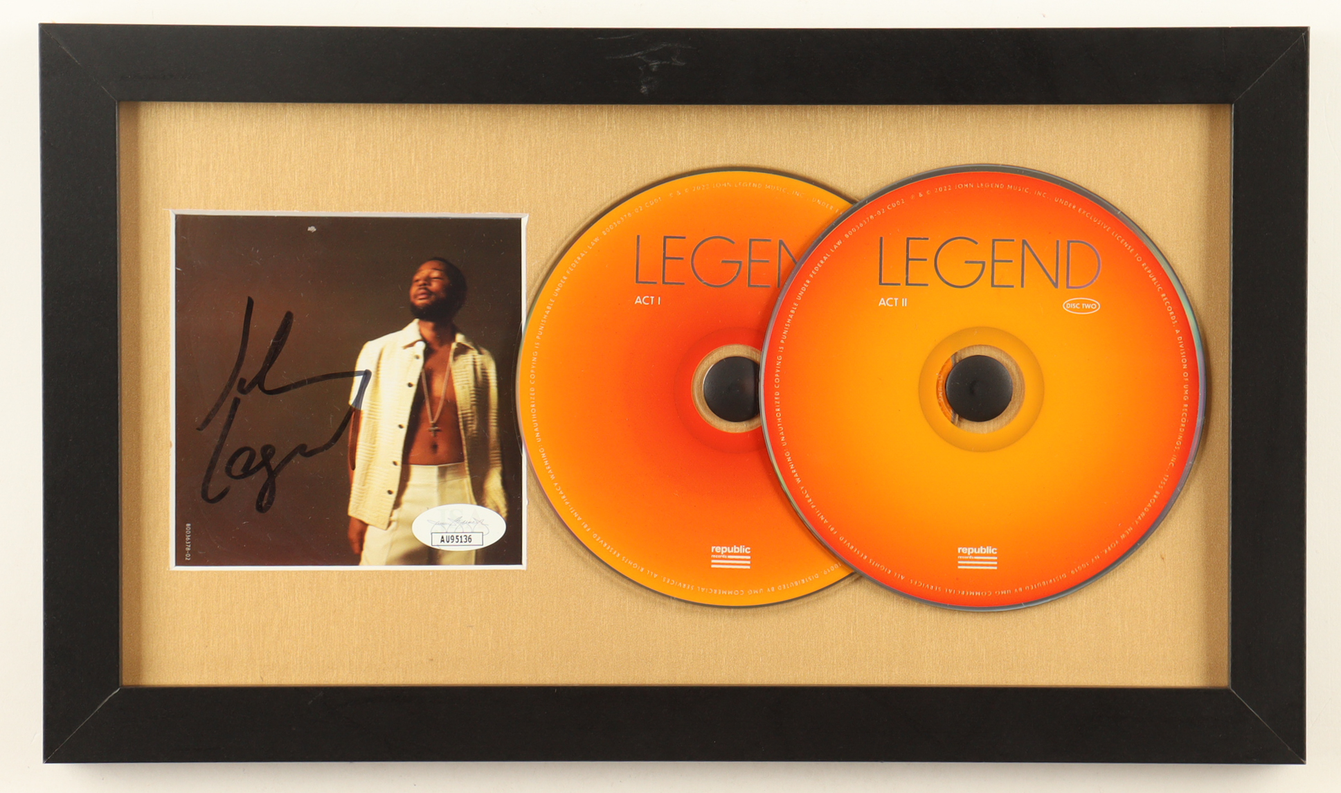 Custom frame measures approximately 7.75" x 13.25" in size and features a "Legend" CD insert that has been hand-signed by John Legend. Please note, the discs are included as shown and there is scuffing throughout the frame.