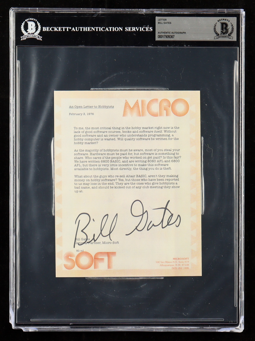 1976 Microsoft Computer Hobbyist Open Letter has been hand-signed by Bill Gates. Please note, the bottom left corner of the encapsulation is cracked.
