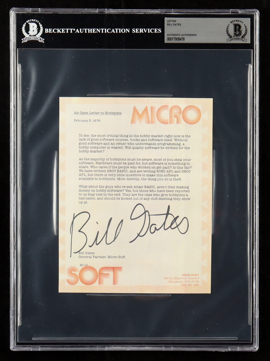 1976 Microsoft Computer Hobbyist Open Letter has been hand-signed by Bill Gates.
