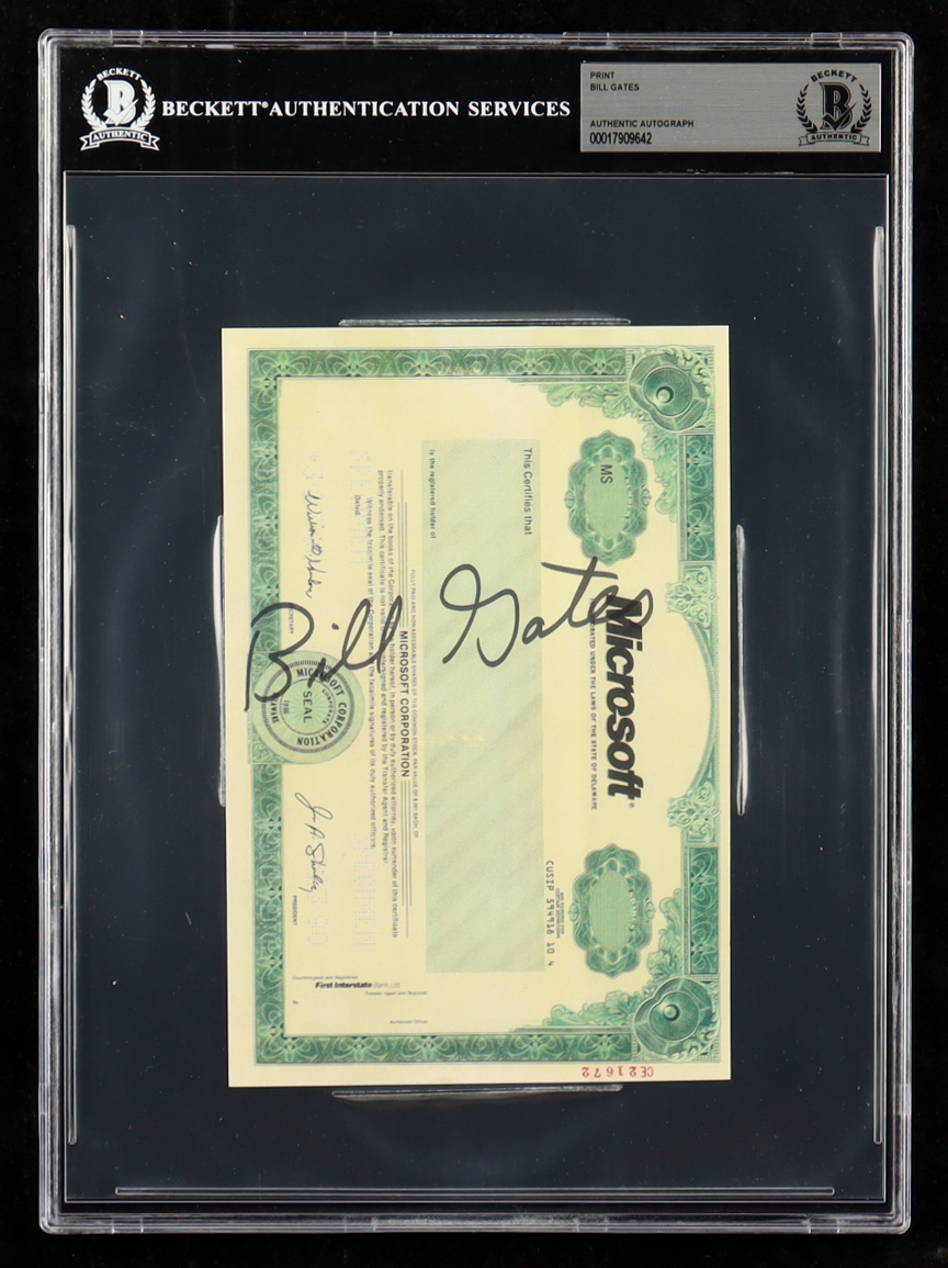 Microsoft Stock certificate print has been hand-signed by Bill Gates. Please see photos for details regarding the condition of the certificate print.