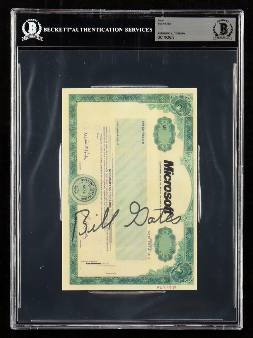 Microsoft Stock certificate print has been hand-signed by Bill Gates. Please see photos for details regarding the condition of the certificate print.