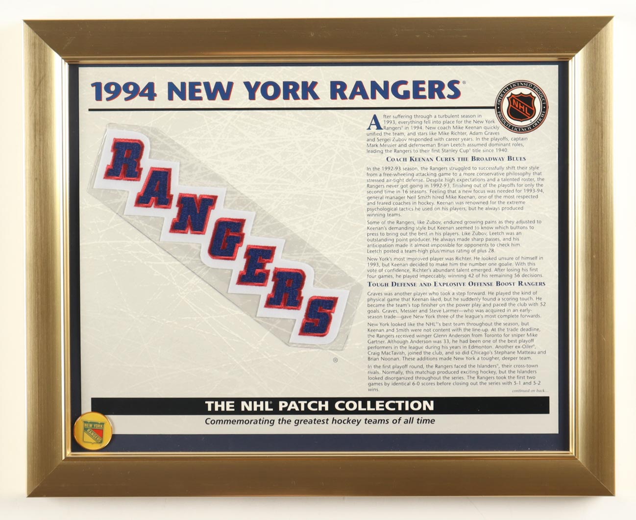 Custom Framed Display measures approximately 13" x 16" in dimension and features a 1994 New York Rangers Commemorative Stat Card with uniform patch. The display also includes a team logo pin. Please note, there is scuffing on the frame.
