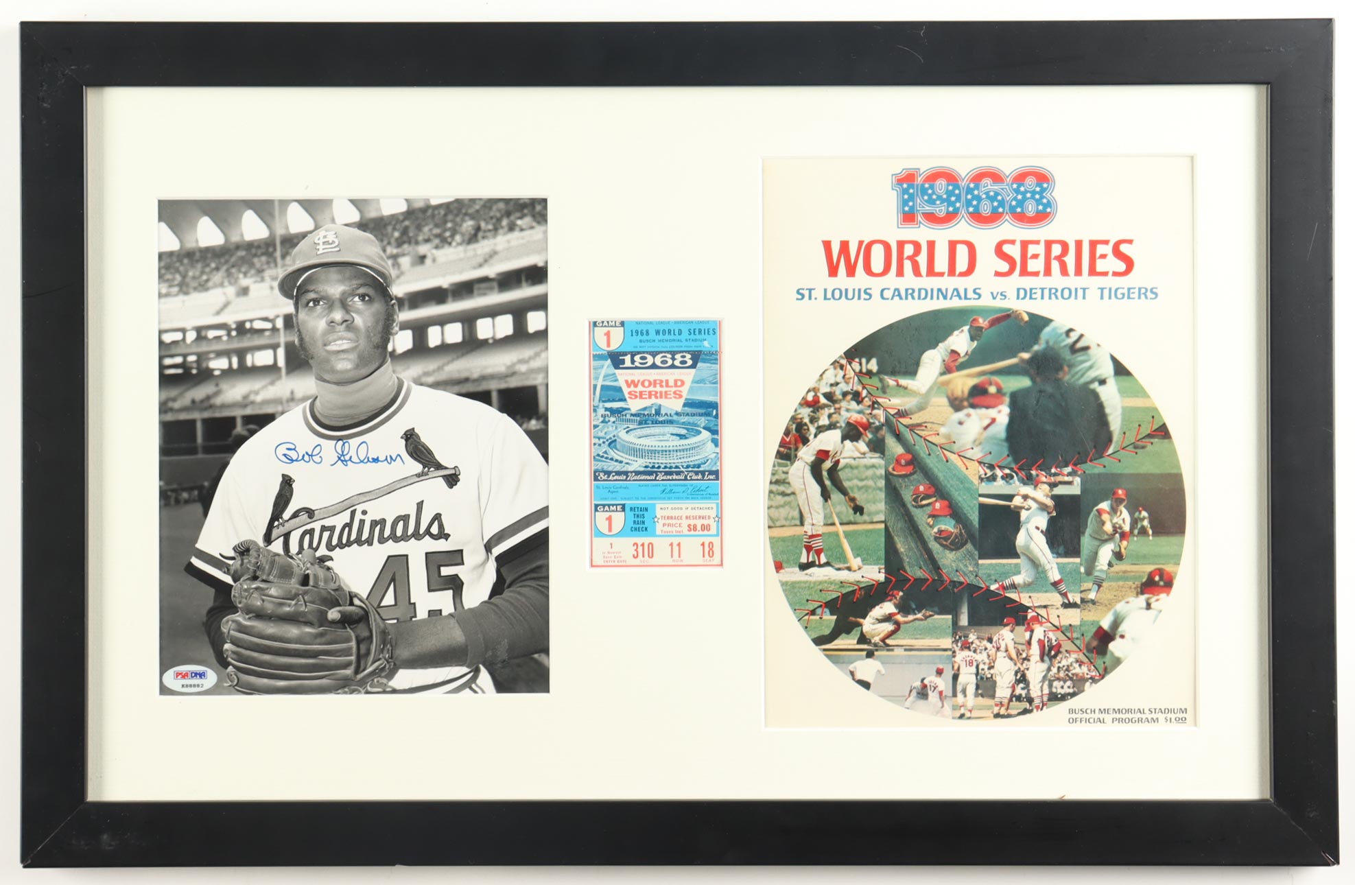 Bob Gibson Signed Cardinals Custom Framed Photo Display With 1968 World Series Ticket & Program (PSA)