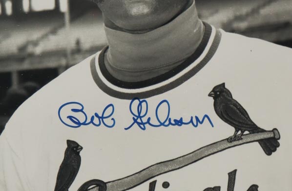 Custom frame measures approximately 16" x 24" in size and features a photo that has been hand-signed by Bob Gisbon (D. 2020, St. Louis Cardinals, HOF). Display also includes 1968 original World Series game 1 ticket and program vs the Detroit Tigers.