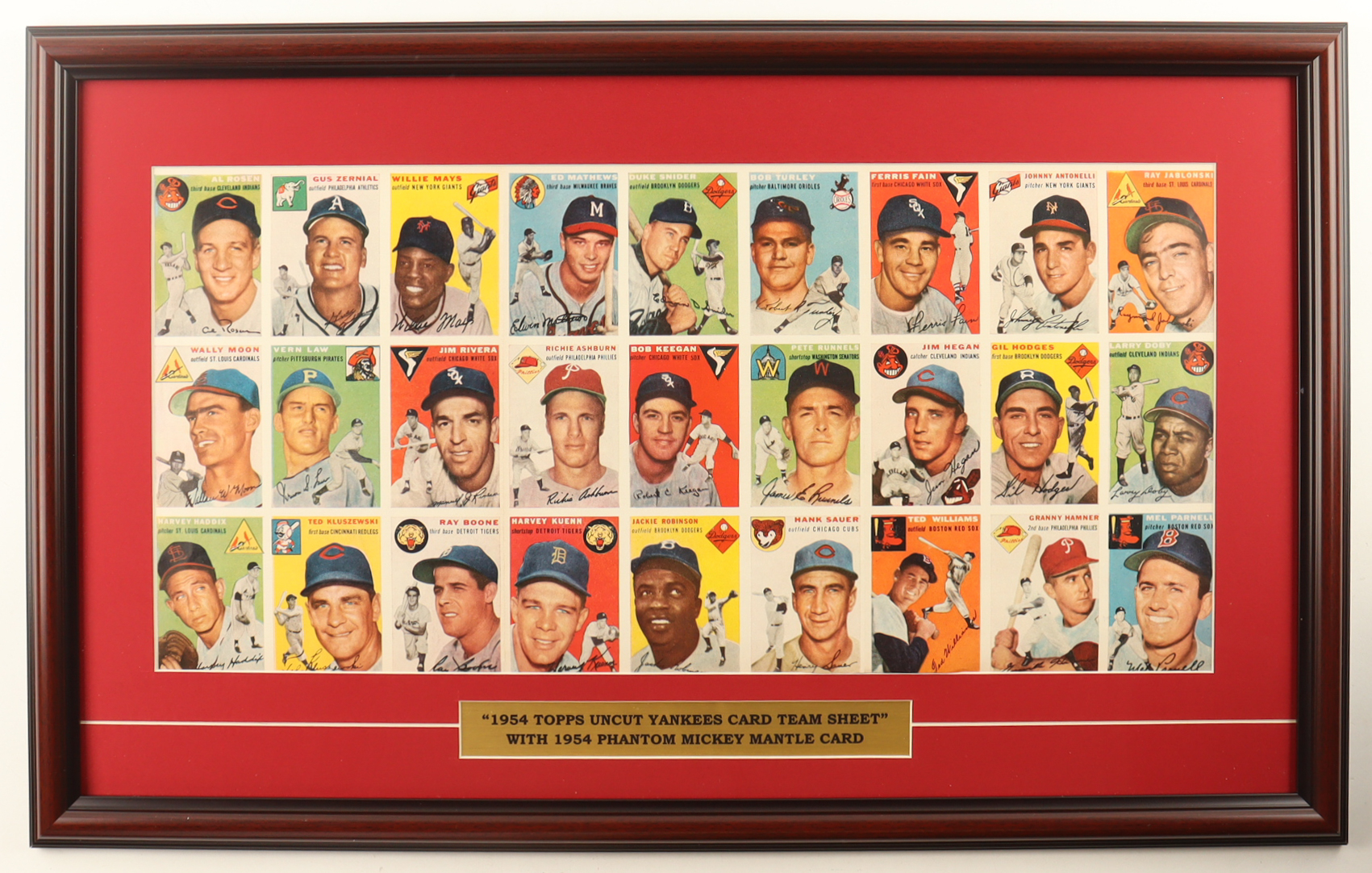 Custom framed display measures approximately 18" x 29" in size and features an uncut sheet of 1954 Topps baseball cards. Please note that the item is unsigned.