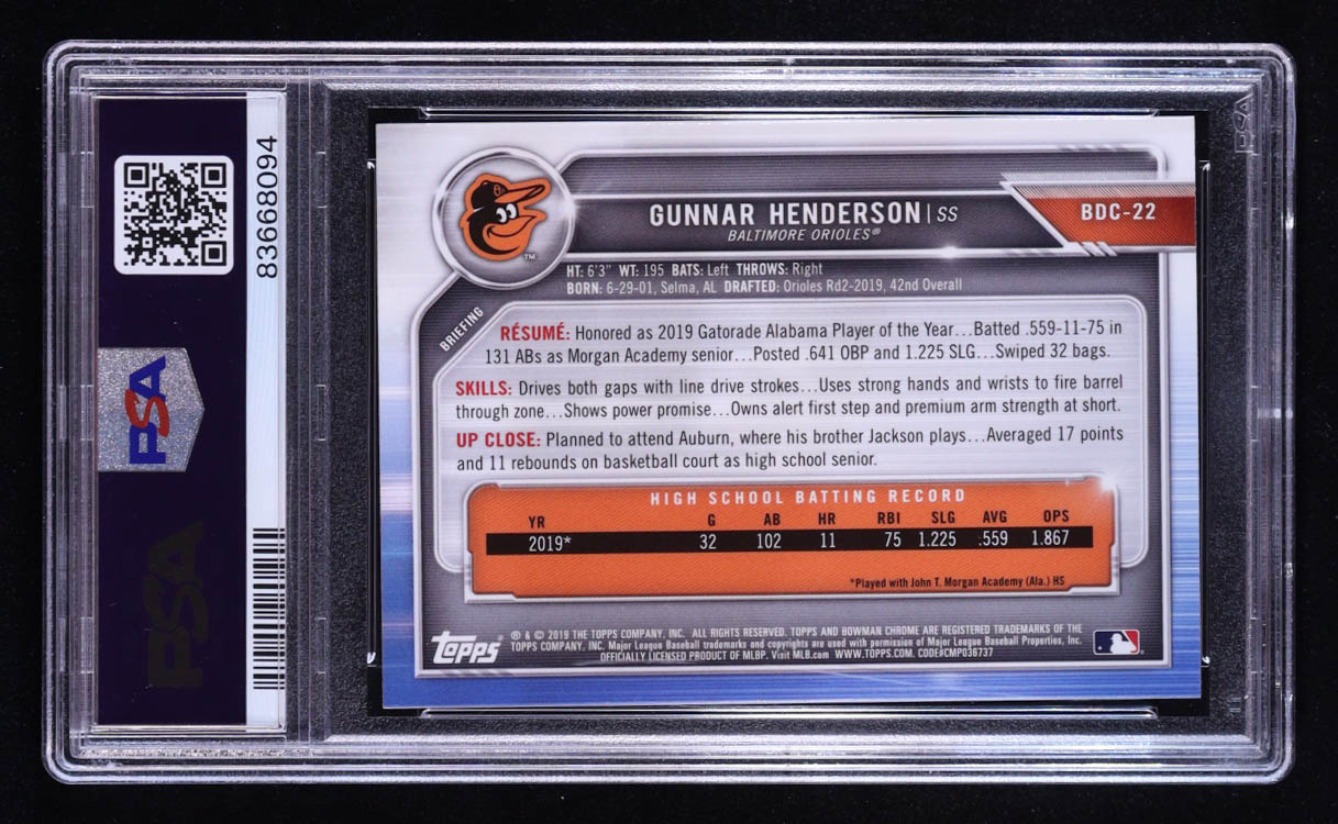 Gunnar Henderson 2019 Bowman Draft Chrome #BDC22 RC (PSA 10)