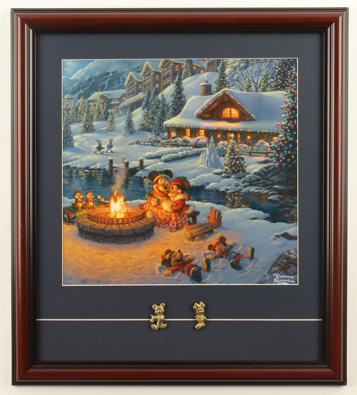 Custom frame measures approximately 16" x 18" in size and features a print of "Mickey & Minnie By The Campfire" by Thomas Kinkade (D. 2012). The display also includes Mickey & Minnie Mouse brass Pins. Please note, the display is unsigned.