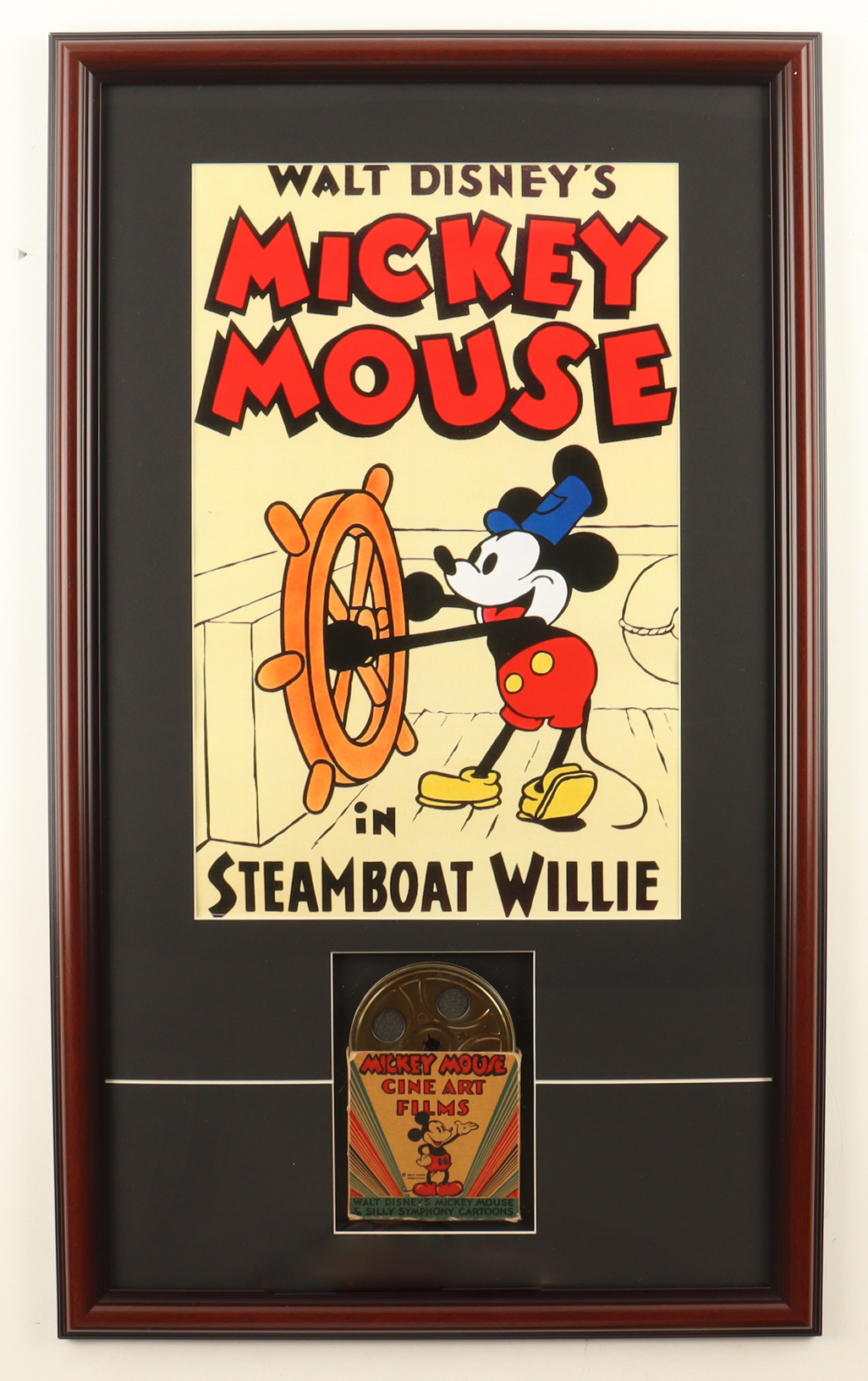 Custom frame measures 17" x 29" in size. Display features an 11" x 17" poster and a Mickey Mouse Cine Art 8mm film reel in original packaging.
