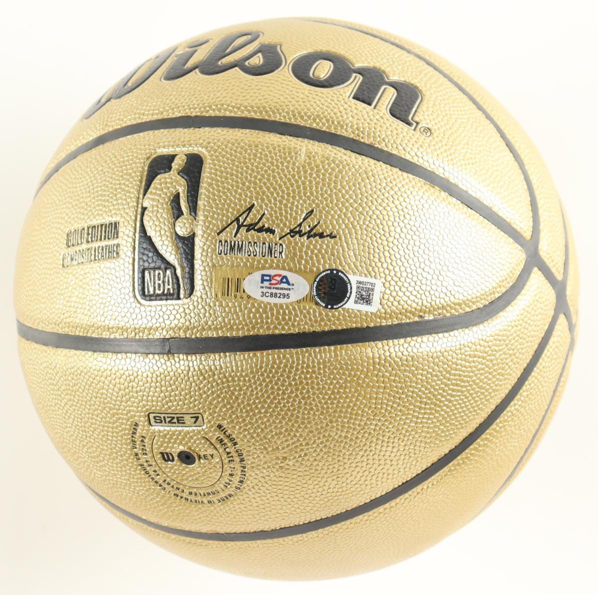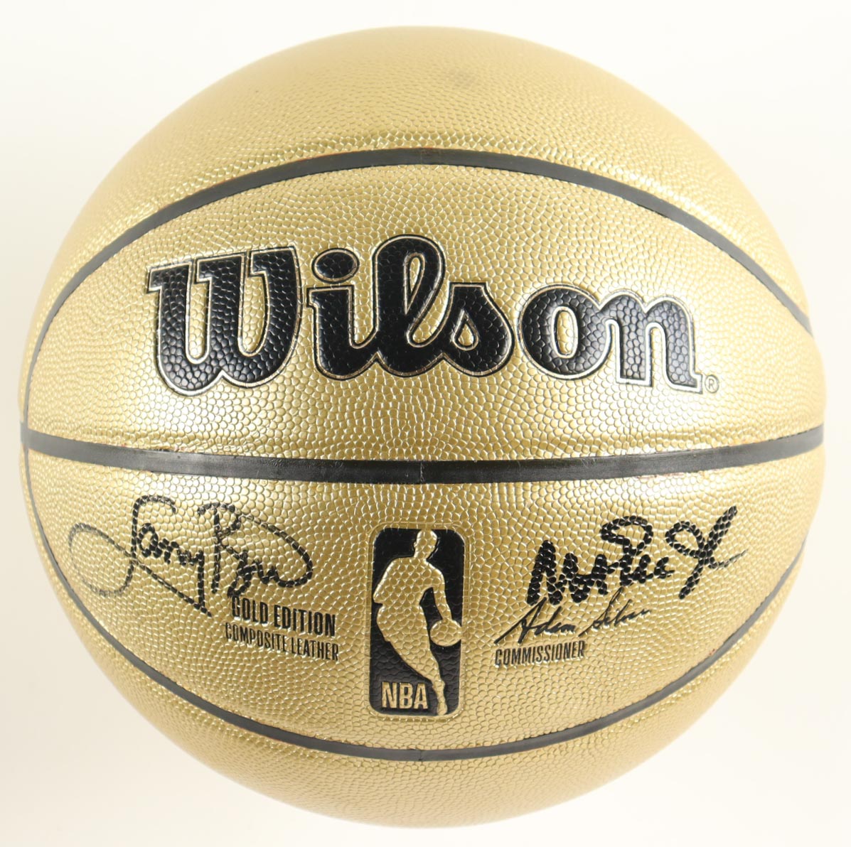Wilson Gold Edition basketball With Display Stand has been hand-signed by Larry Bird (Boston Celtics, HOF) & Magic Johnson (Los Angeles Lakers, HOF).