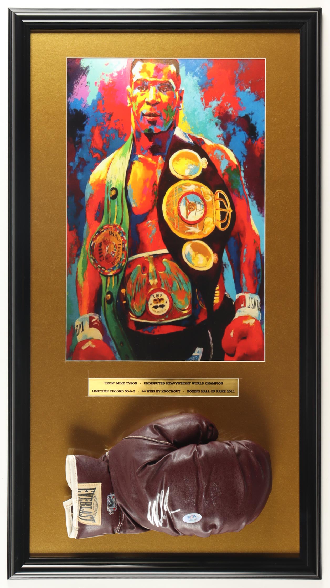Custom frame measures 17" x 31" in size. Features a boxing glove that has been hand-signed by Mike Tyson (HOF).