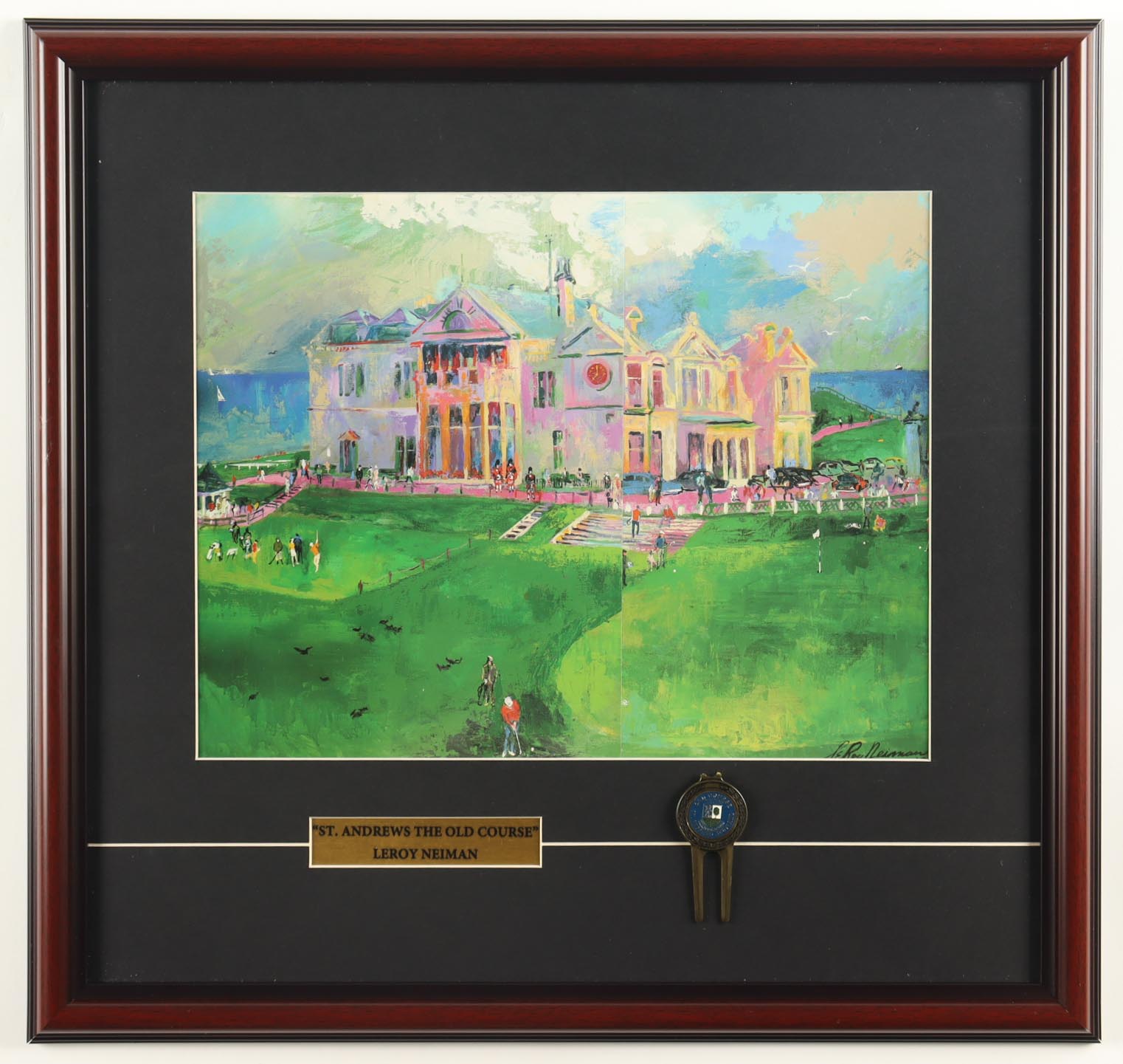 Leroy Neiman "The Old Course At St. Andrews" Custom Framed Print Display with British Open St. Andrews Divot Tool