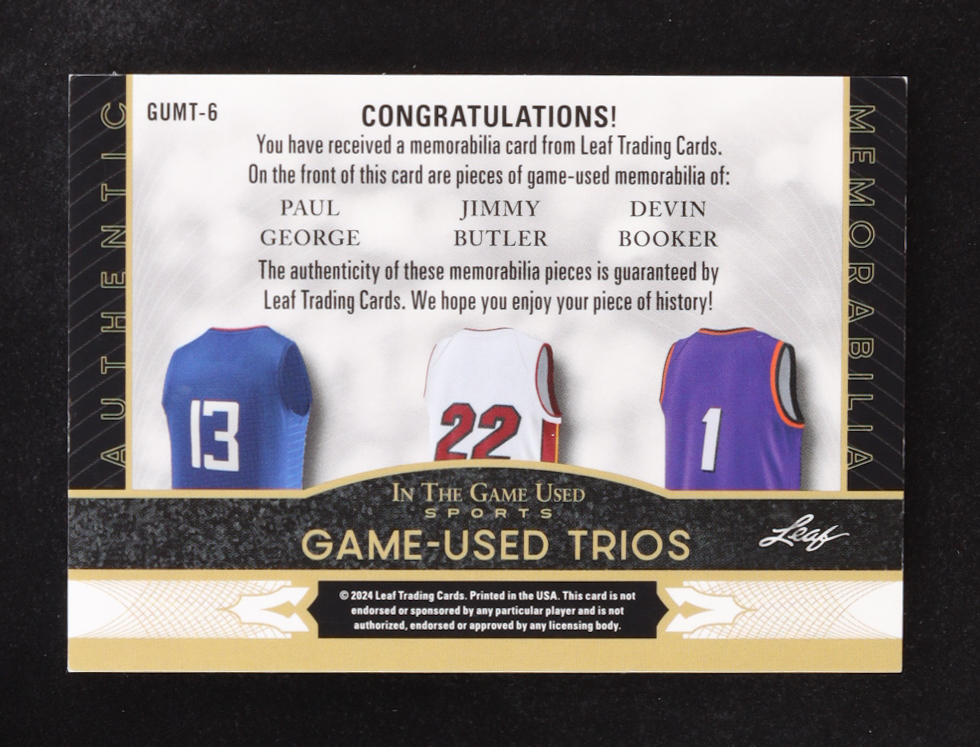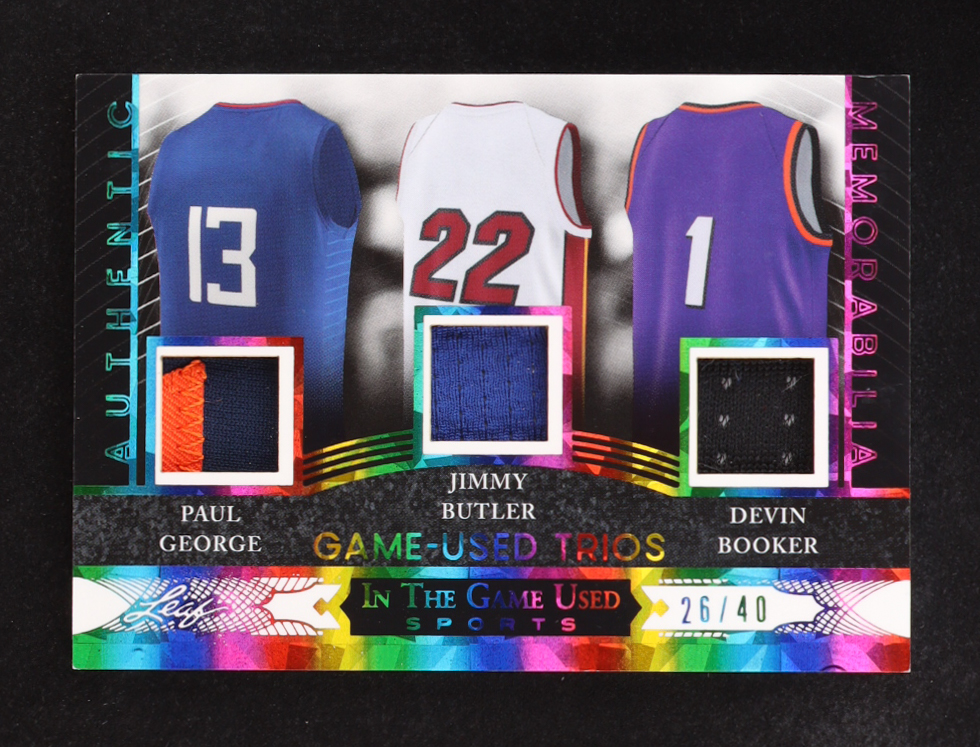 Paul George / Jimmy Butler / Devin Booker 2024 Leaf ITG Used Game-Used Trios Crystal Rainbow #GUMT6 #26/40