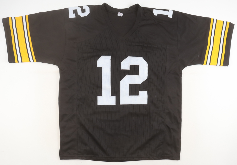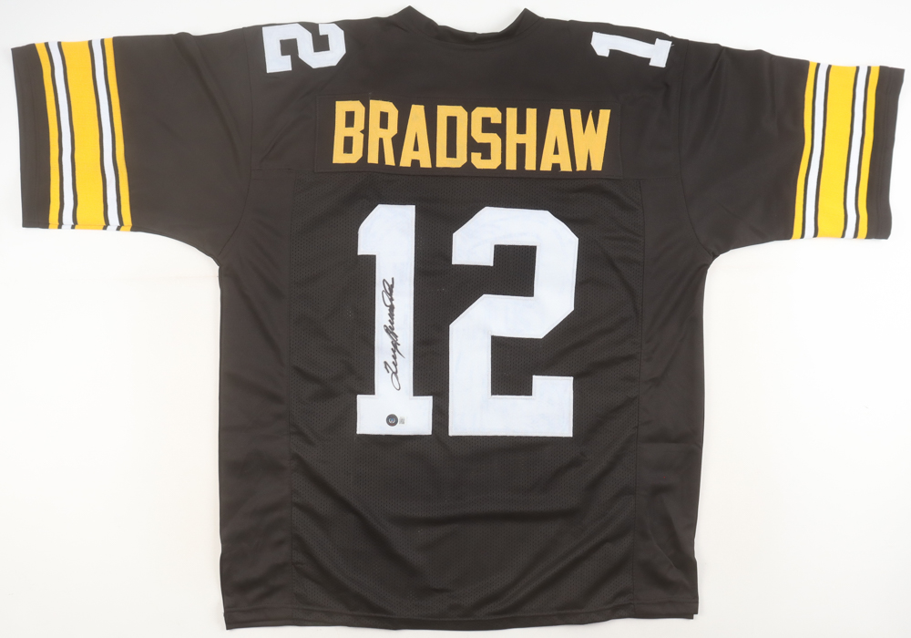 Custom jersey with everything sewn on, size XL. Hand signed by Terry Bradshaw (HOF). Please note, glue is visible through the reverse number. See photos regarding the condition of the item.