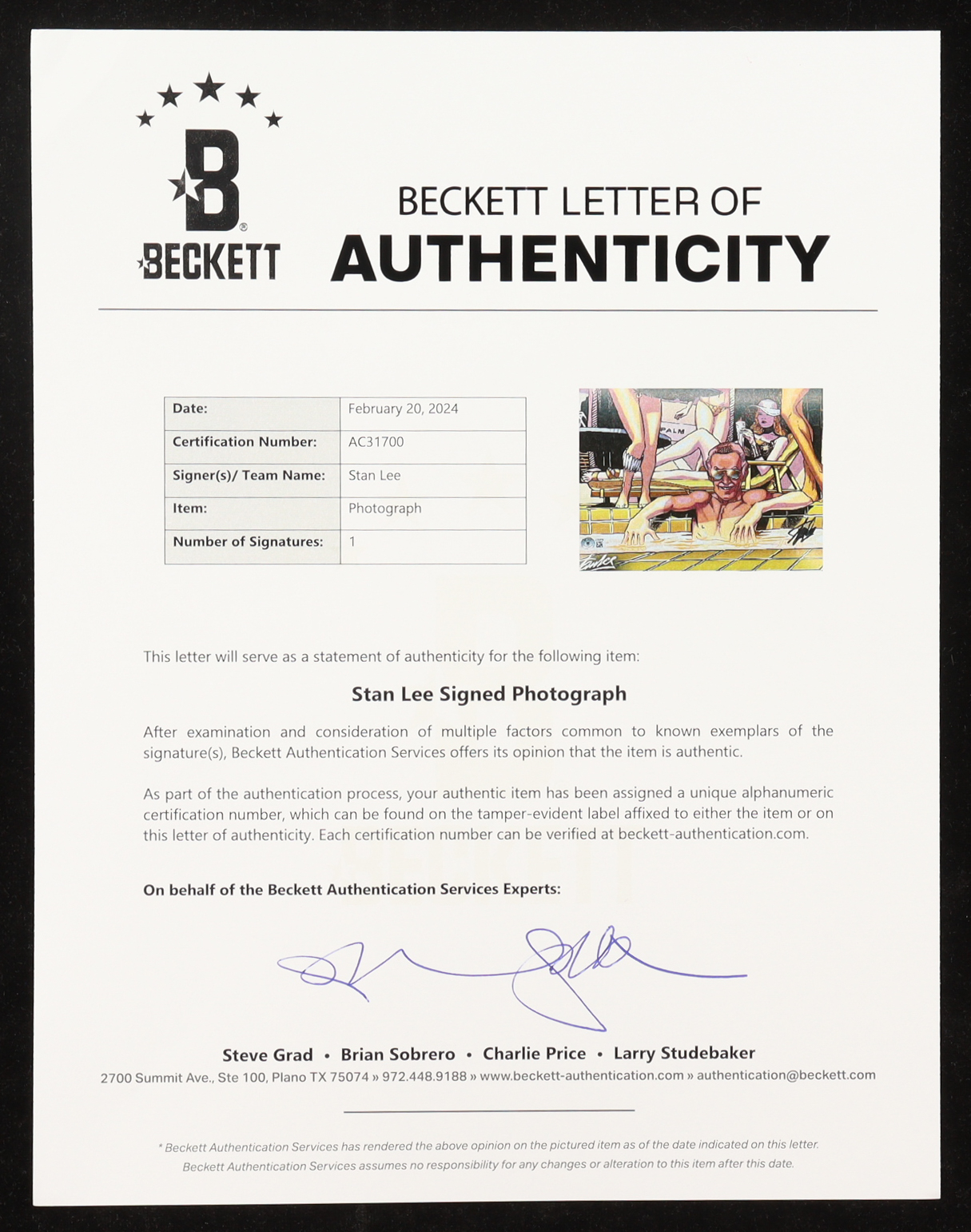 Photo measures 13" x 19" in size and has been hand-signed by Stan Lee (D. 2018).