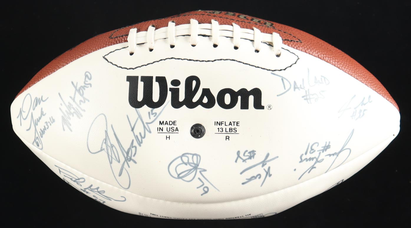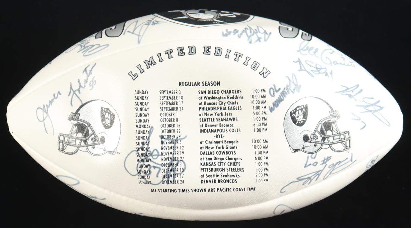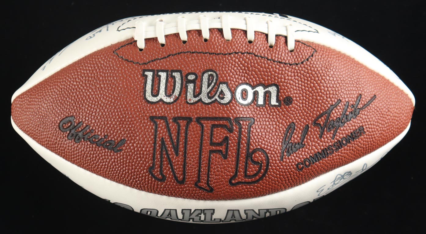 Wilson Oakland Raiders Official NFL logo football has been hand-signed by (22) including Jeff Hostetler, Albert Lewis, Terry McDaniel, Kevin Gogan, Greg Biekert, Andrew Glover, Eddie Anderson, Dan Turk, James Trapp, Aundray Bruce, Anthony Smith, Jeff Gossett, Joe Aska, James Folston, Mike Morton, Dan Land, Russell Freeman, Keith Franklin, Joe King, Rich Stephens, Jeff Kysar and Tom Robsock. Please note, the football does not inflate.