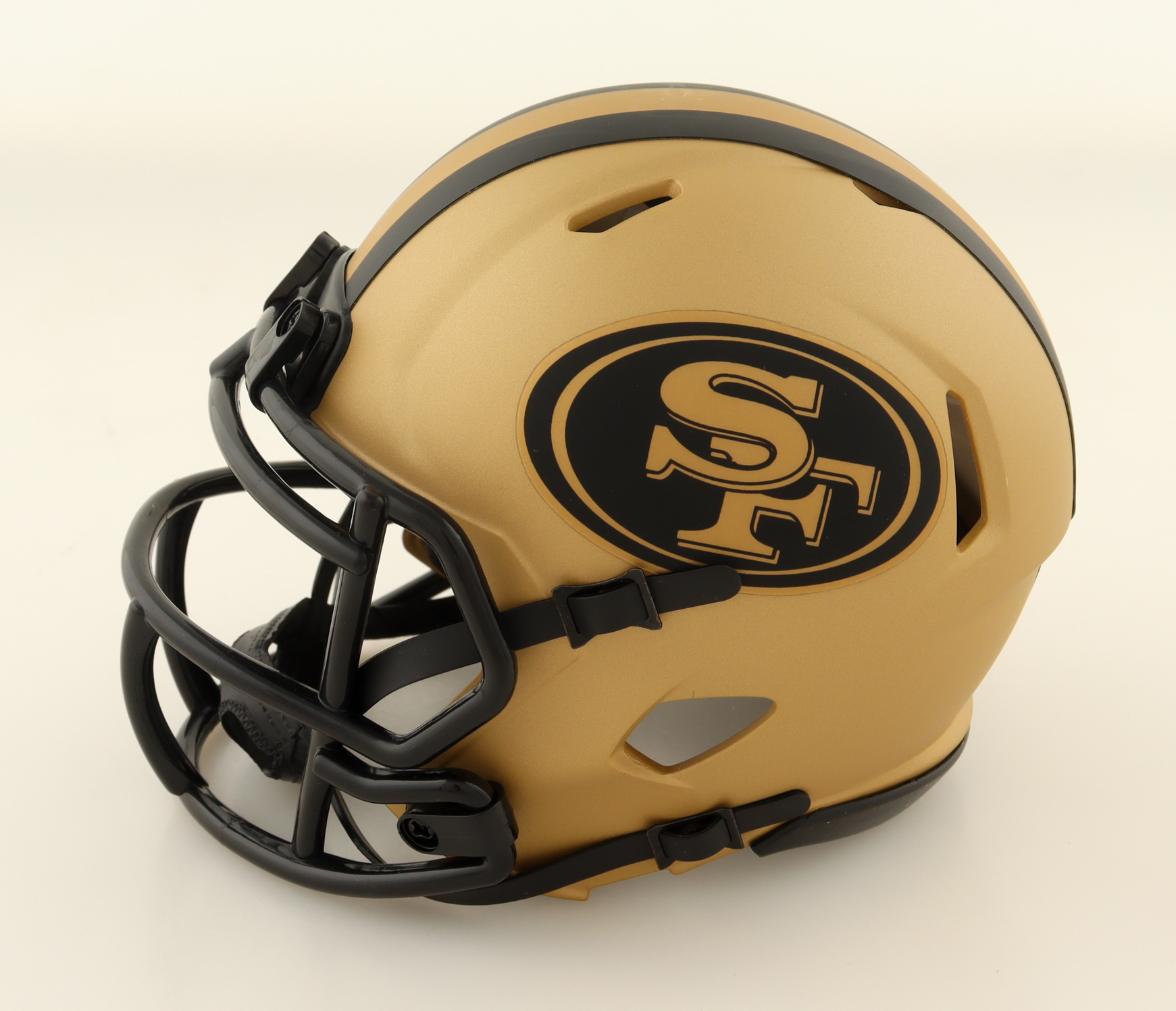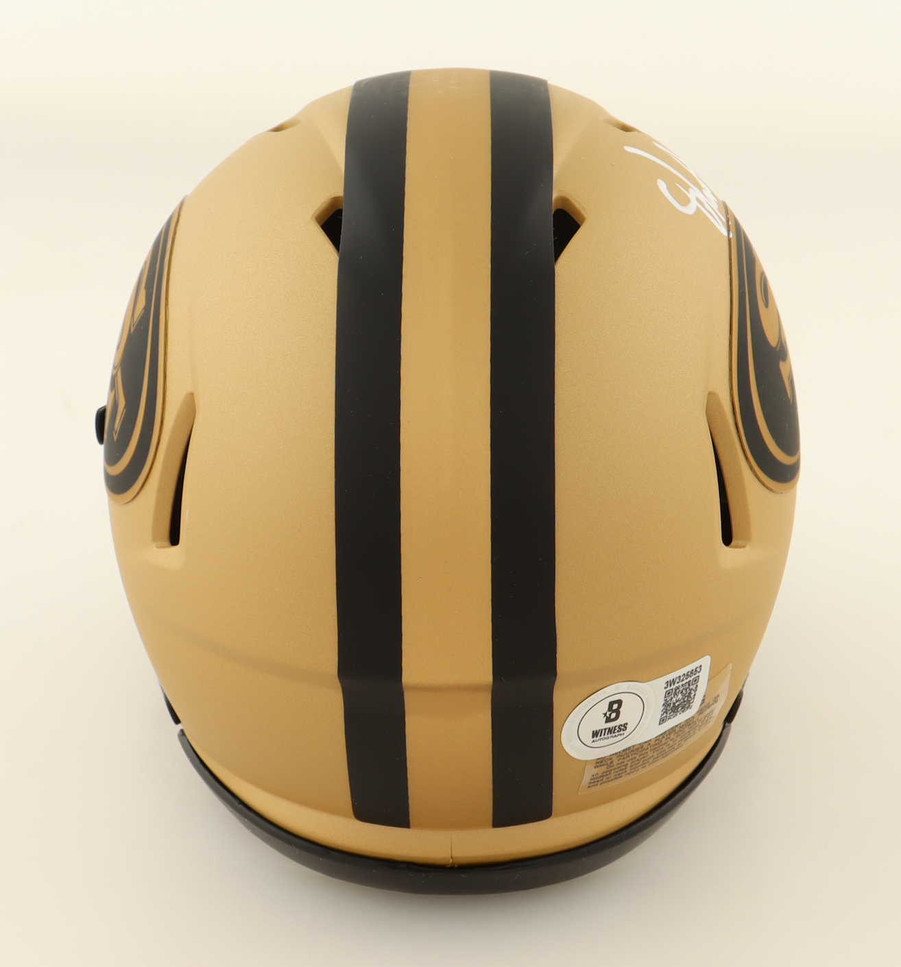 Riddell San Francisco 49ers Rave alternate speed mini helmet has been hand-signed by Upton Stout.