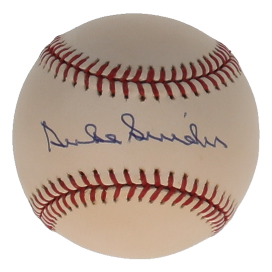 Rawlings Official National League Baseball. Hand-signed by Duke Snider (D. 2011, Los Angeles Dodgers, HOF). Please note, the baseball is naturally toned and stained throughout.