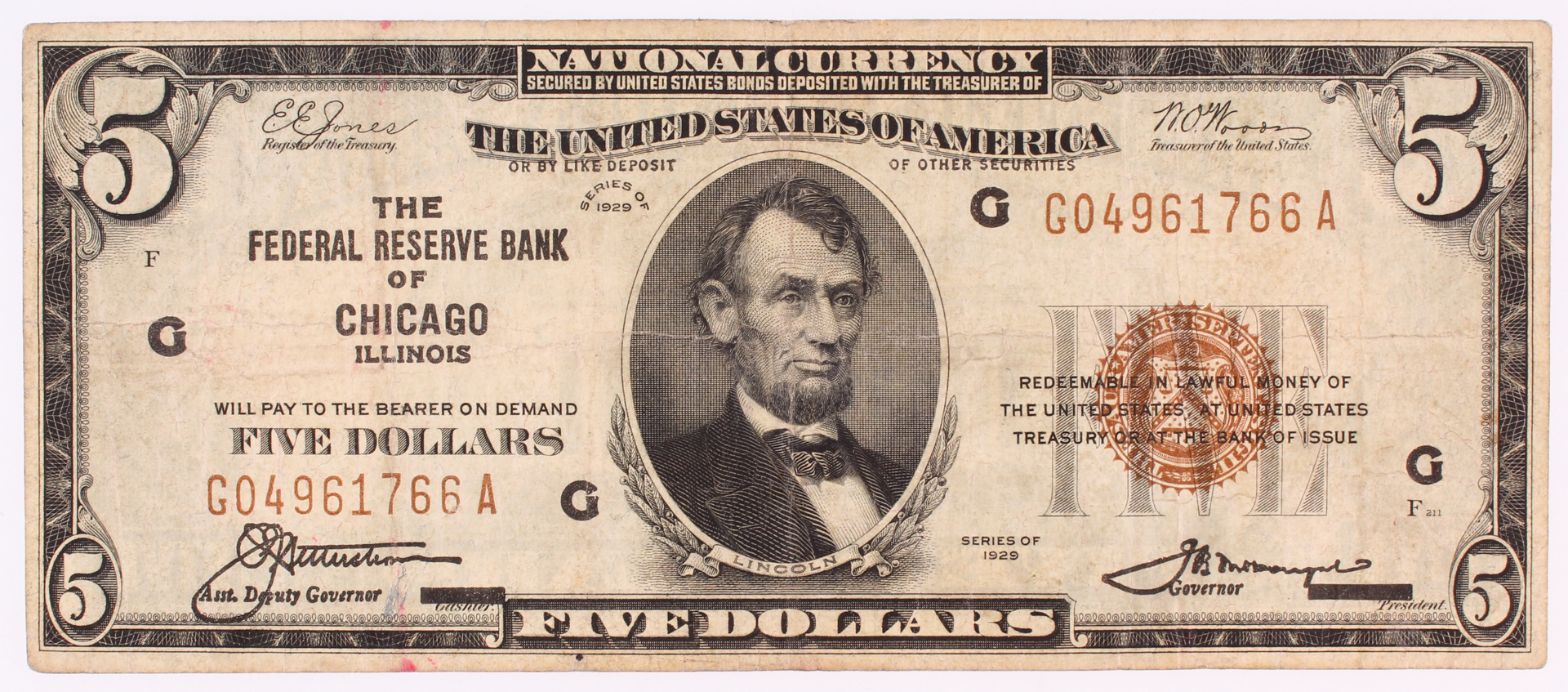 1929 $5 Five-Dollar Brown Seal United States National Currency Bank Note (The Federal Reserve Bank of Chicago Illinois)