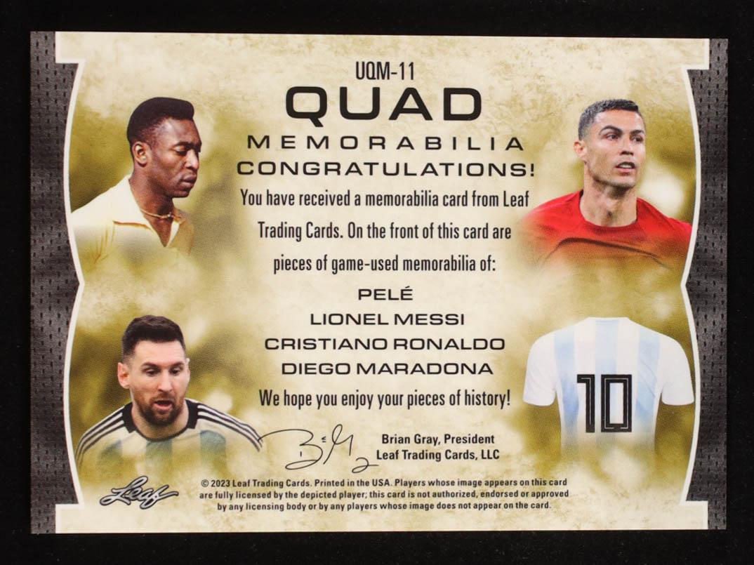 Lionel Messi/Diego Maradona/Pele/Christiano Ronaldo 2023 Leaf Ultimate Soccer Quad Green Memorabilia #UQM11 #09/10
