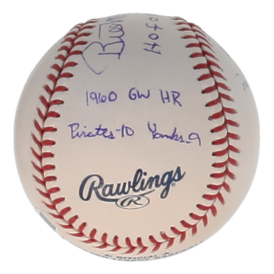 Rawlings Official Major League Baseball. Hand-signed and inscribed by Bill Mazeroski (Pittsburgh Pirates, HOF). Please note, there are minor stains throughout the baseball.