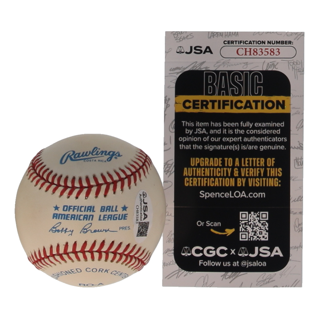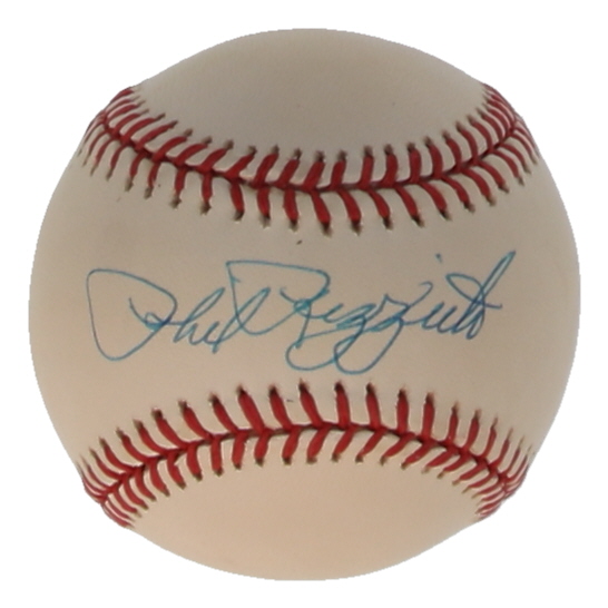 Rawlings Official American League Baseball. Hand-signed by Phil Rizzuto (D. 2007, New York Yankees, HOF). Please note, the baseball is naturally toning and stained.
