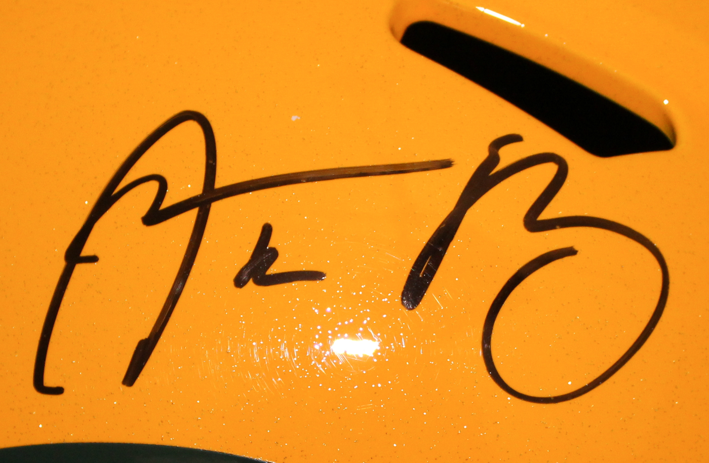 Riddell Full-Size Speed Helmet. Hand-signed in black felt-tip pen by Aaron Rodgers.