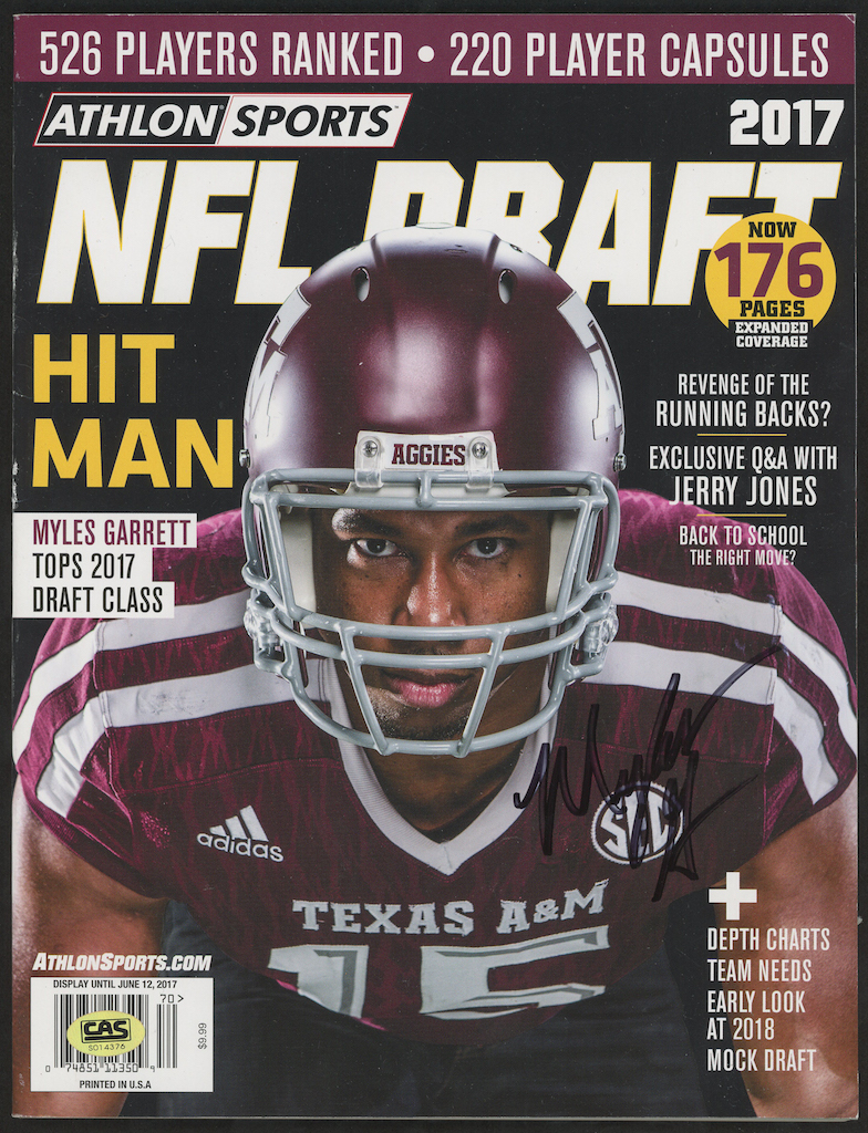 2017, Volume 4 Athlon Sports "NFL Draft" Magazine volume #4 has been hand-signed in black felt-tip pen by Myles Garrett (Browns).