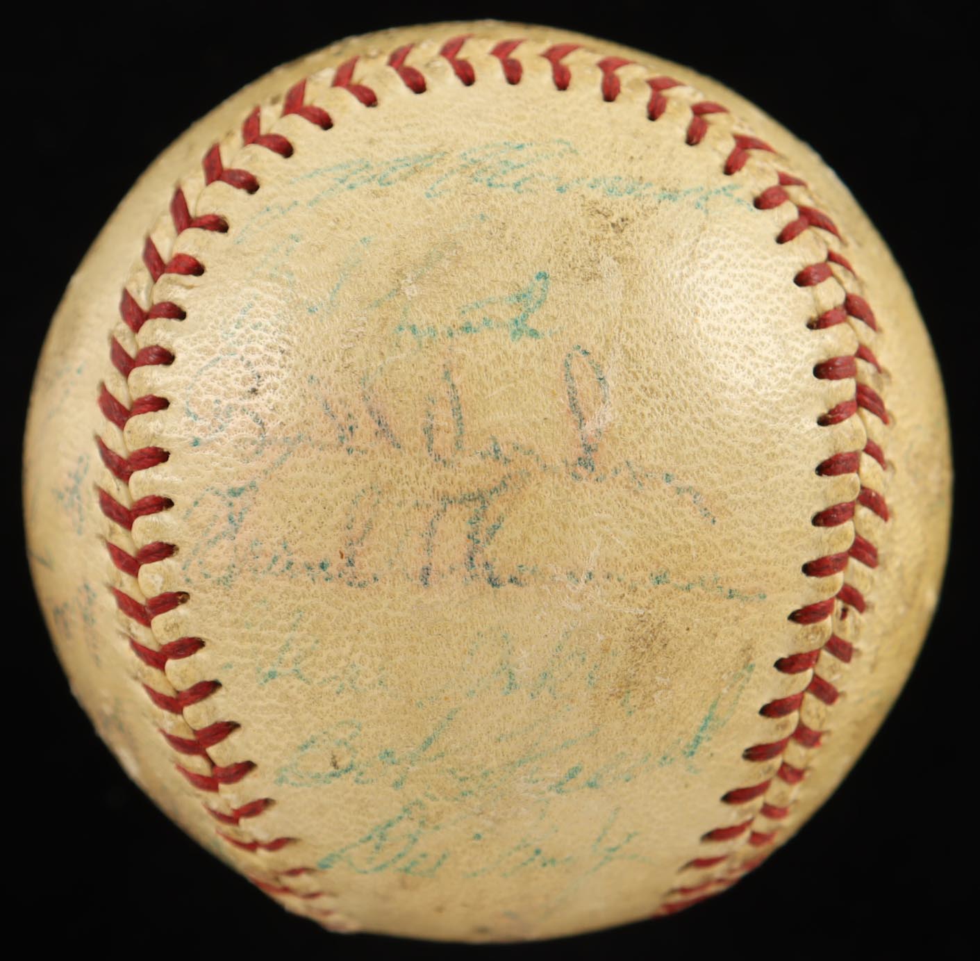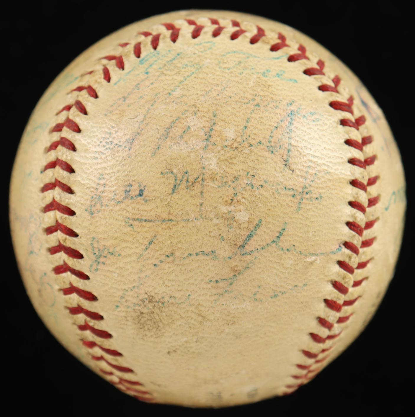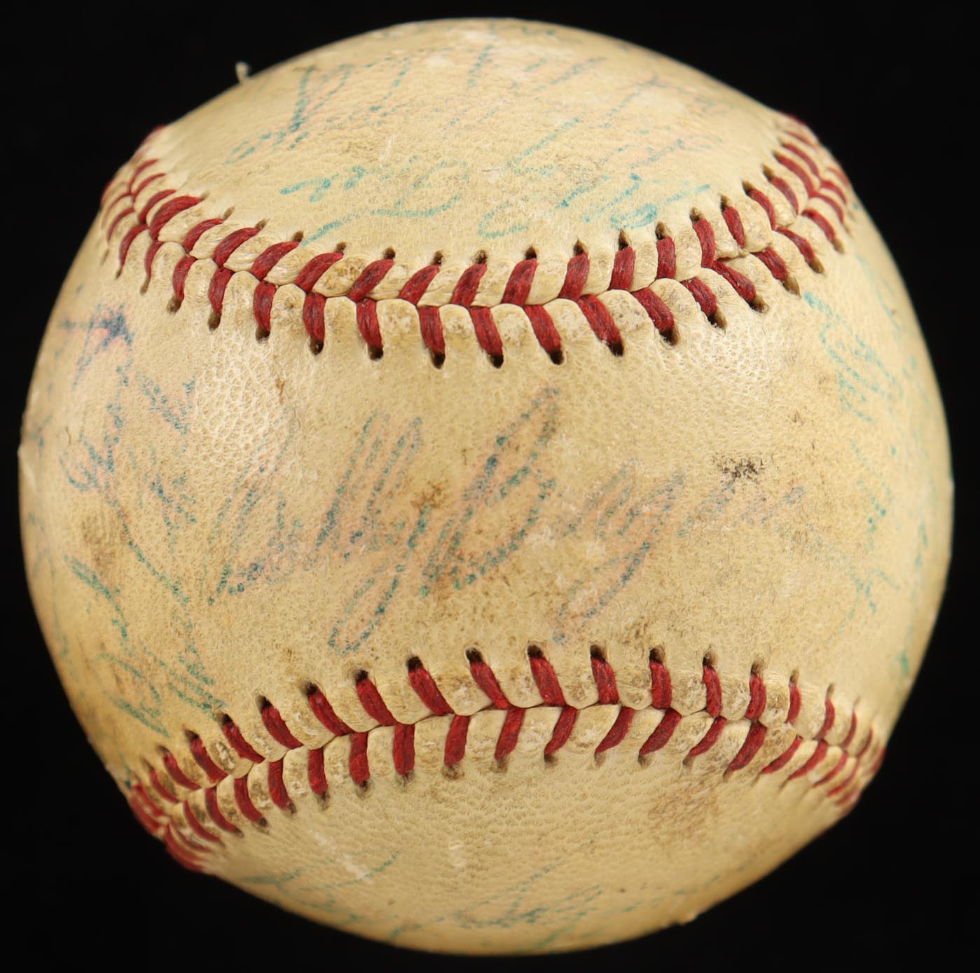 Spalding Official National League Baseball. Hand-signed by Roberto Clemente, Bill Mazeroski, Bobby Bragan, Vern Law, Dick Groat, Roy Face, Bill Virdon, Frank Thomas, Bob Friend, Bob Skinner, Bob Purkey, Hank Foiles, Joe Trimble, and (9) others. Please note, the baseball is naturally toned and the majority of the signatures are faded.