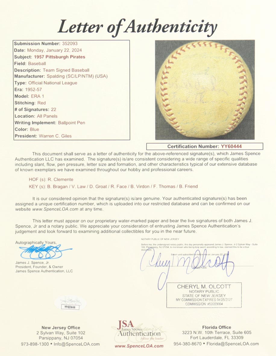 1957 Pirates | ONL Baseball Team-Signed by (22) with Roberto Clemente, Bill Mazeroski, Bobby Bragan, Vern Law (JSA)