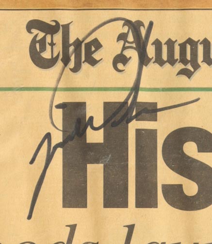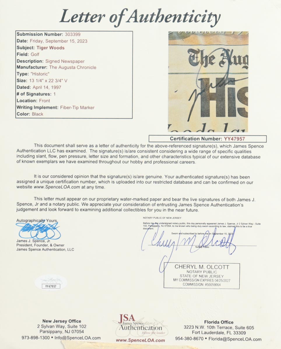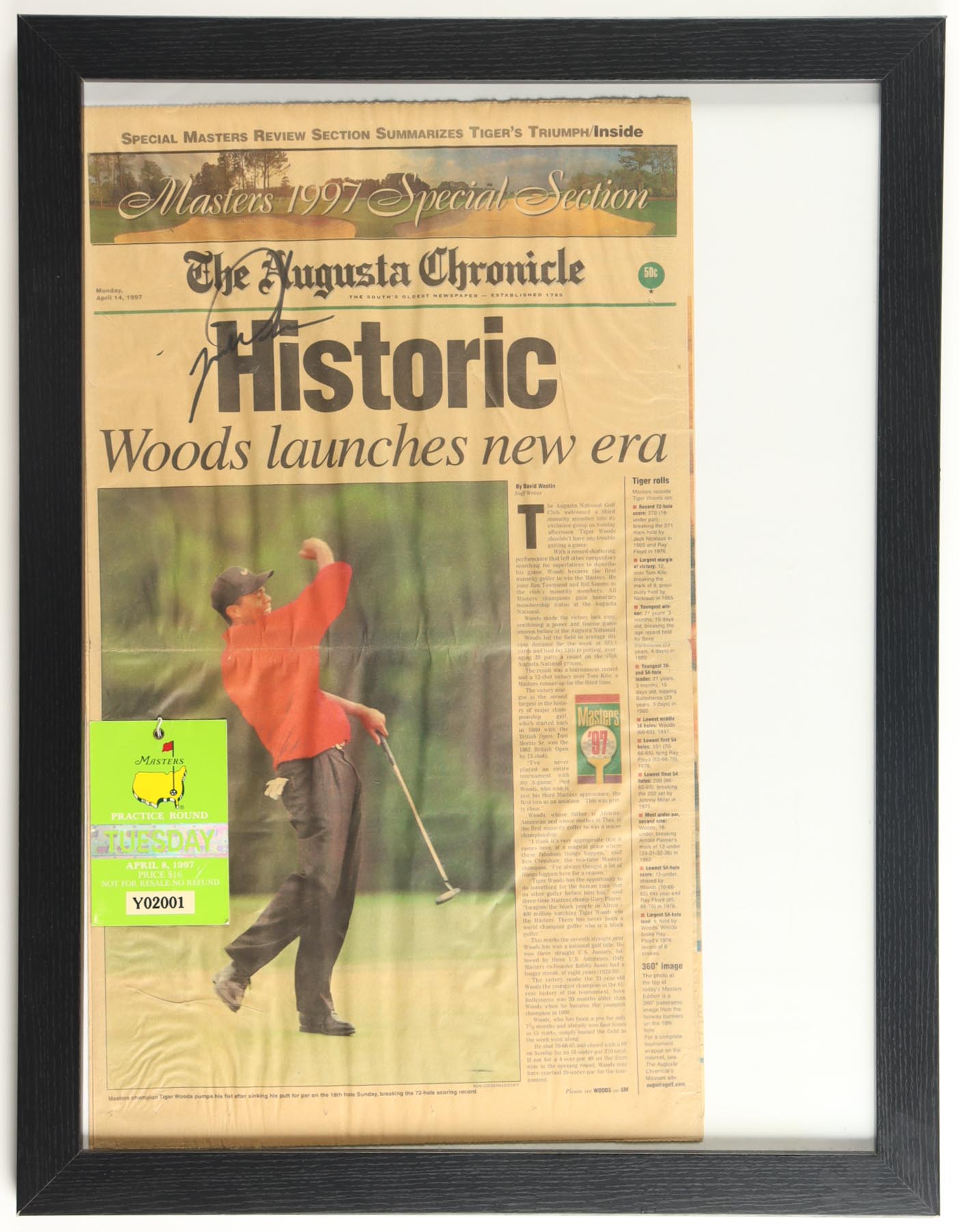 Custom frame measures approximately 20" x 26" in size. Features "The Augusta Chronicle" Newspaper that is dated April 14th, 1997 and it has been hand-signed by Tiger Woods (HOF). The display also includes a Masters Tournament Practice Round Ticket