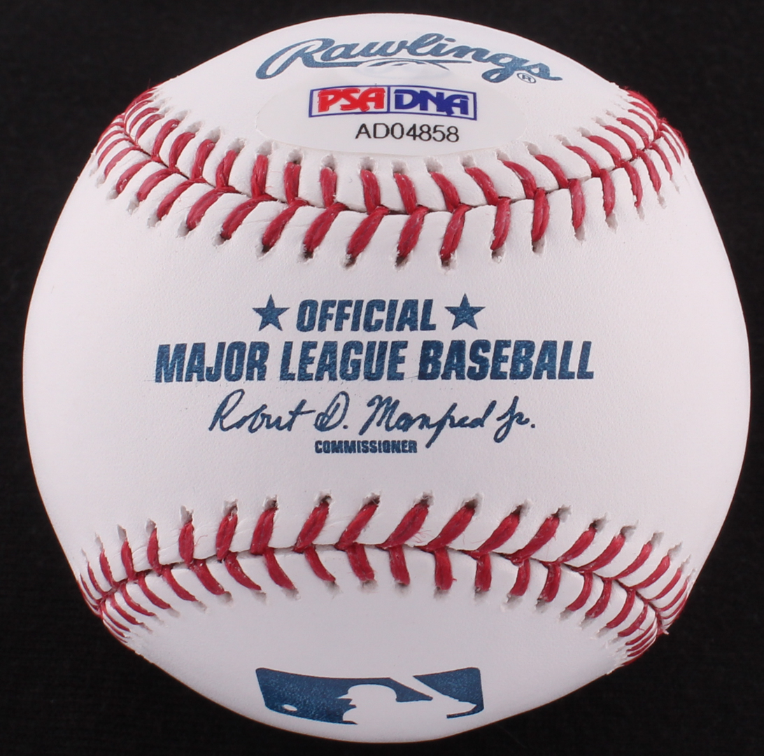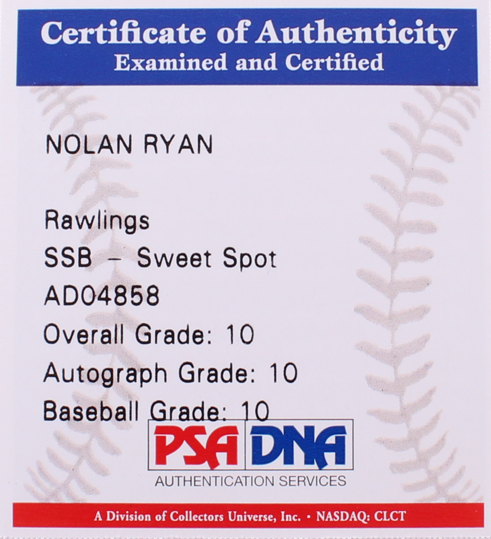 Rawlings Official Major League Baseball is (PSA) Graded 10 and has been hand-signed and inscribed in blue ink pen by Nolan Ryan (Astros, HOF).