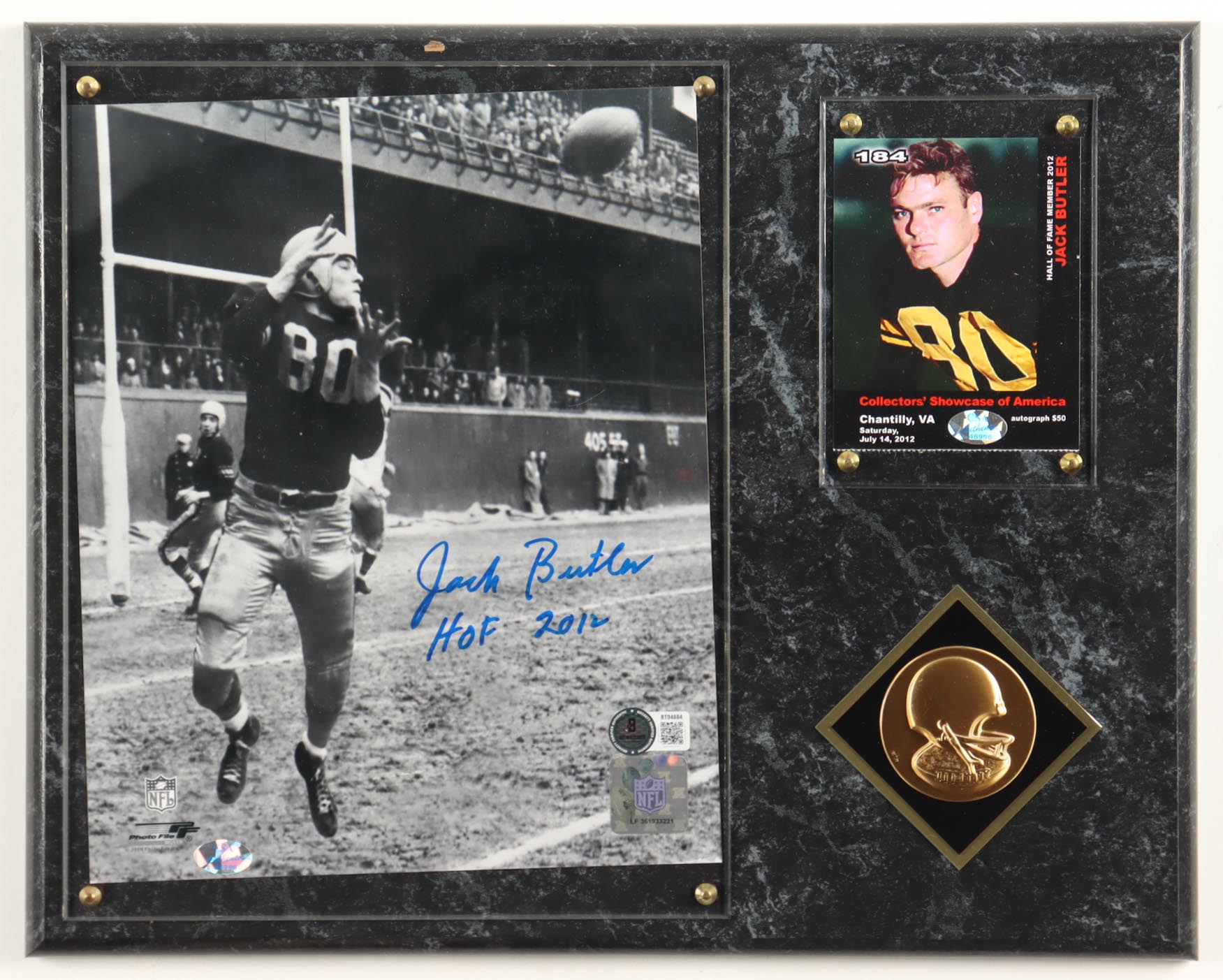 Custom plaque measures 12" x 15" in size. Plaque features an 8" x 10" photograph hand-signed by Jack Butler (Pittsburgh Steelers, HOF). Display also features a player trading card and plastic football emblem.