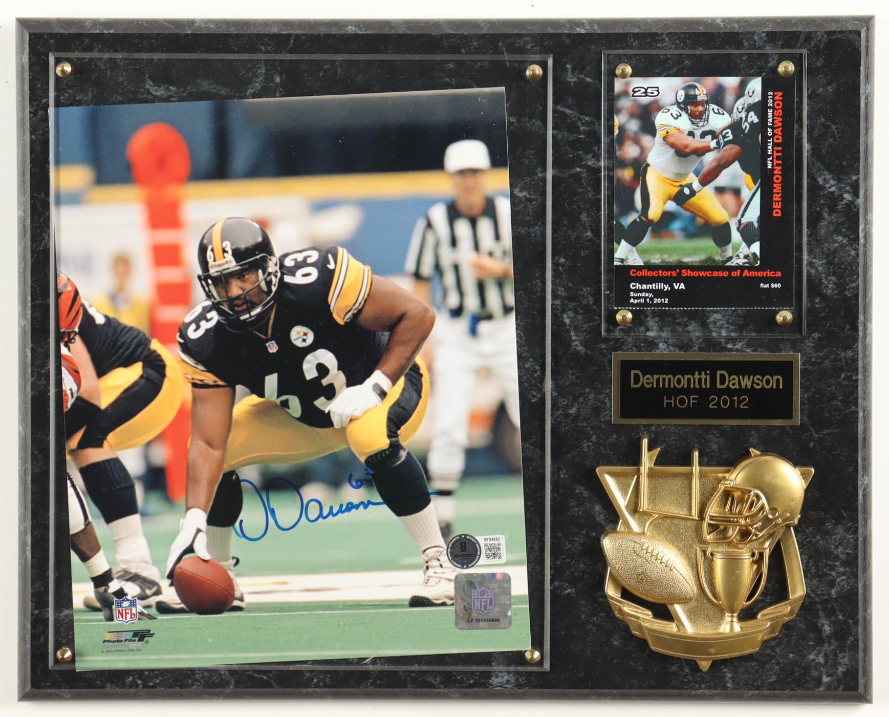 Custom plaque measures 12" x 15" in size. Plaque features an 8" x 10" photograph hand-signed by Dermontti Dawson (Pittsburgh Steelers, HOF). Display also features a player trading card, name plate, and plastic football emblem.