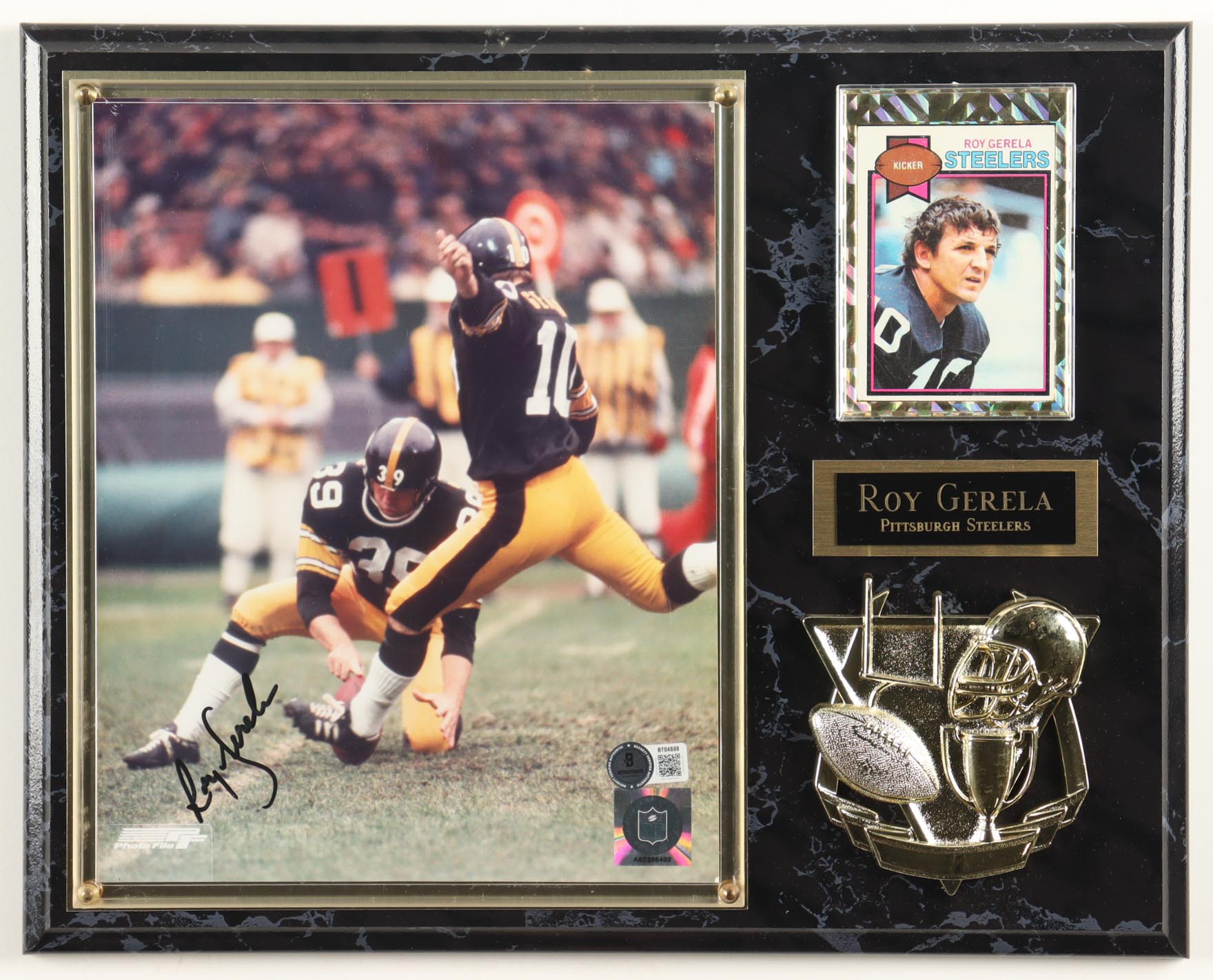 Custom plaque measures 12" x 15" in size. Plaque features an 8" x 10" photograph hand-signed by Roy Gerela (Pittsburgh Steelers). Display also features a player trading card, name plate, and plastic football emblem.