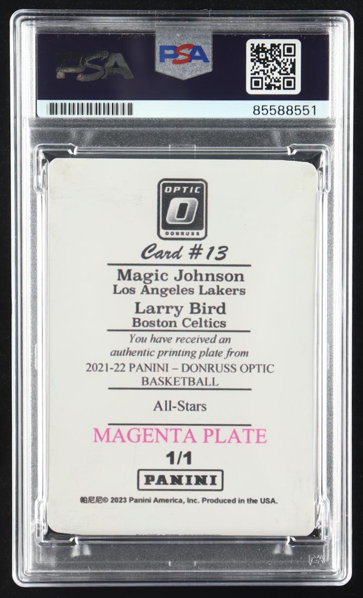 Magic Johnson / Larry Bird Signed 2021-22 Donruss Optic #13 Magenta Printing Plate 1/1 Magic Johnson / Larry Bird (PSA | Auto 10)