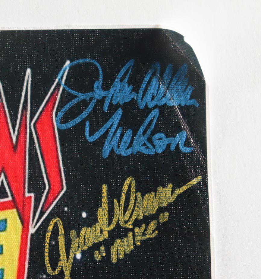 Canvas poster measures 12" x18" in size. Hand-signed by Stephen Chiodo, Charlie Chiodo, Edward Chiodo, Suzanne Snyder, Grant Cramer, John Allen Nelson, Harrod Blank, Mike Martinez, and Paul Haley.