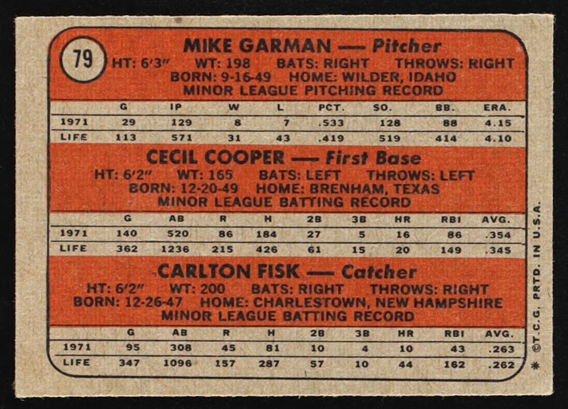 Mike Garman / Cecil Cooper RC / Carlton Fisk RC 1972 Topps Rookie Stars #79