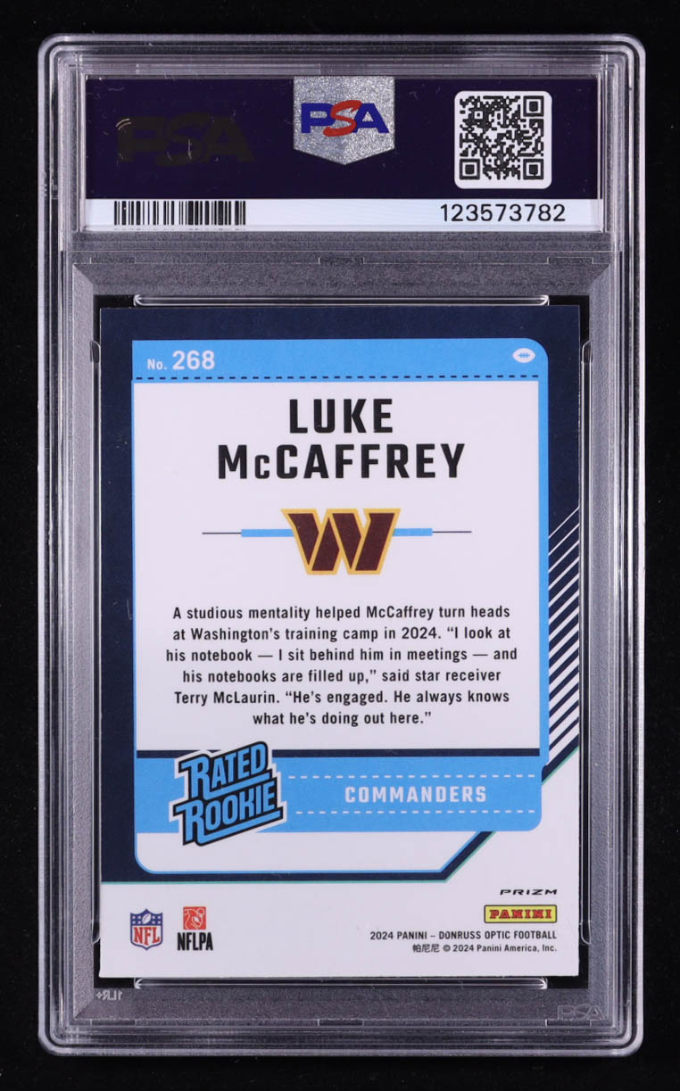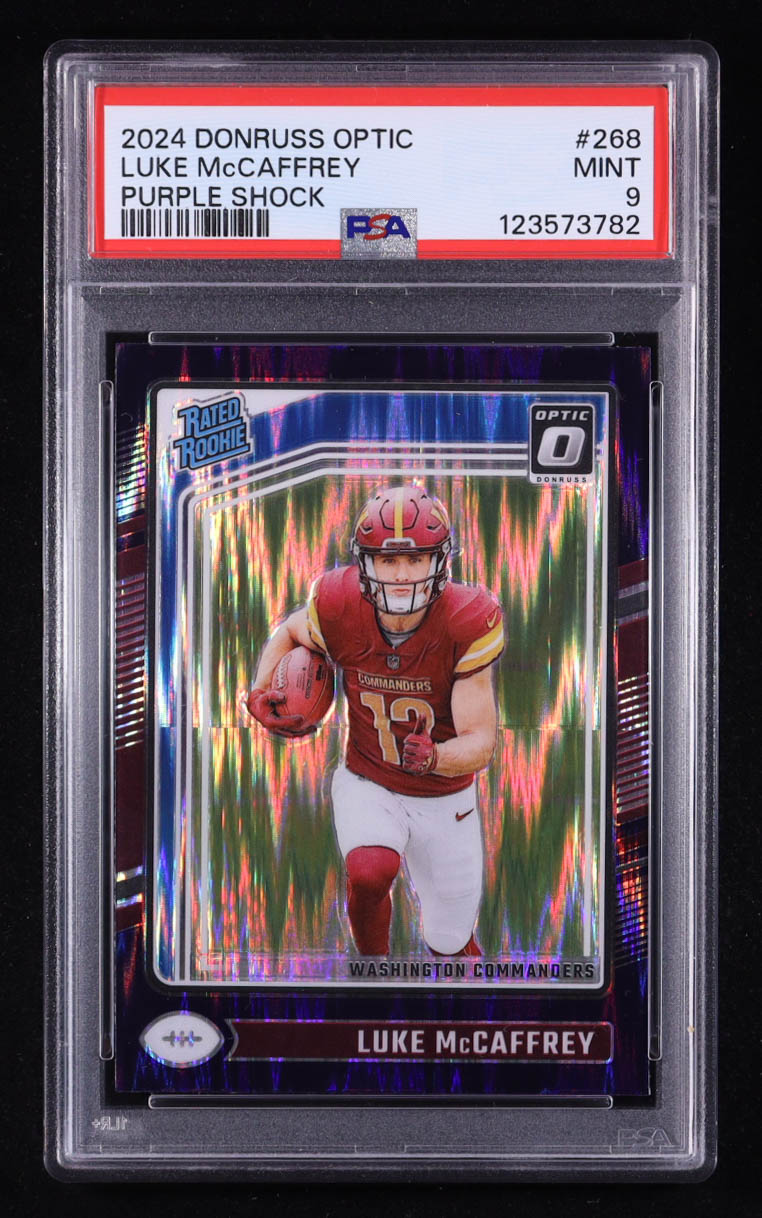 Luke McCaffrey 2024 Donruss Optic Purple Shock #268 RR RC (PSA 9)