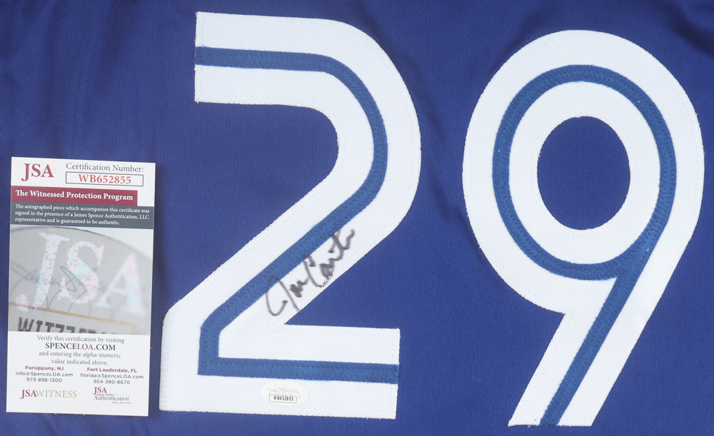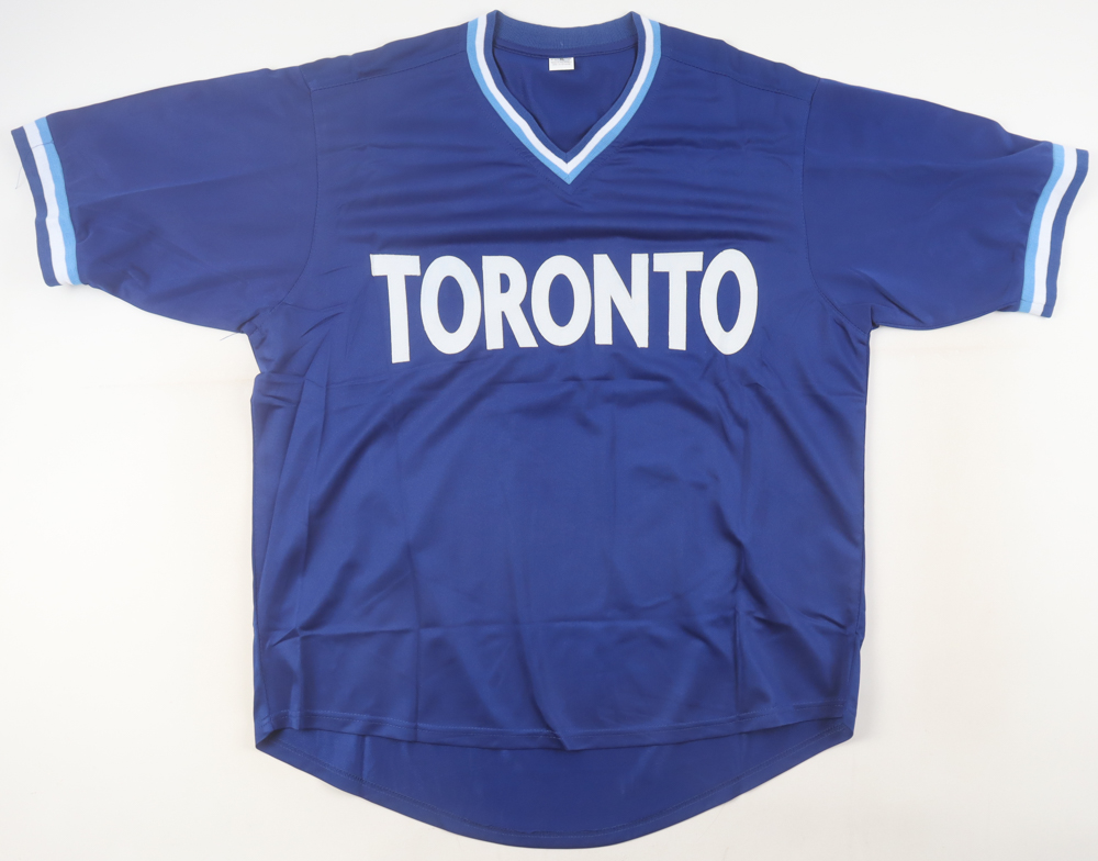 Custom jersey with everything sewn on, size XL. Hand-signed by Joe Carter.
