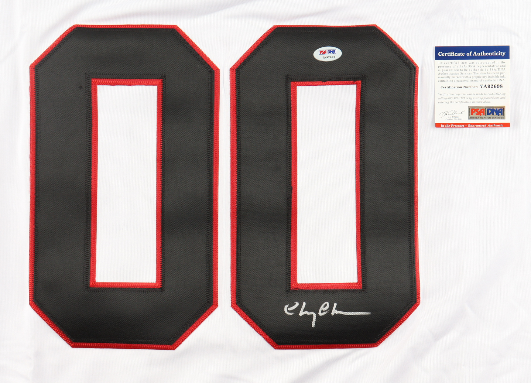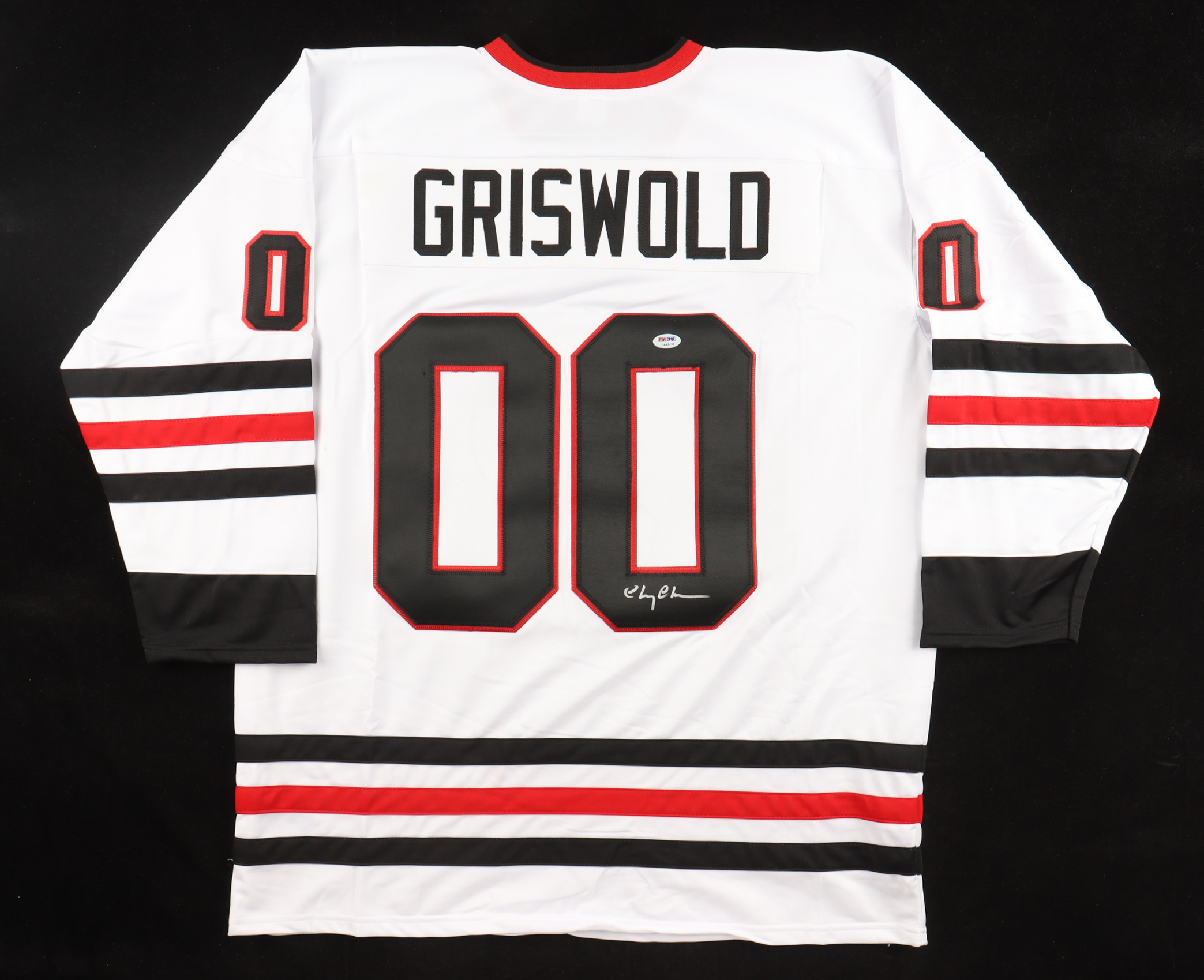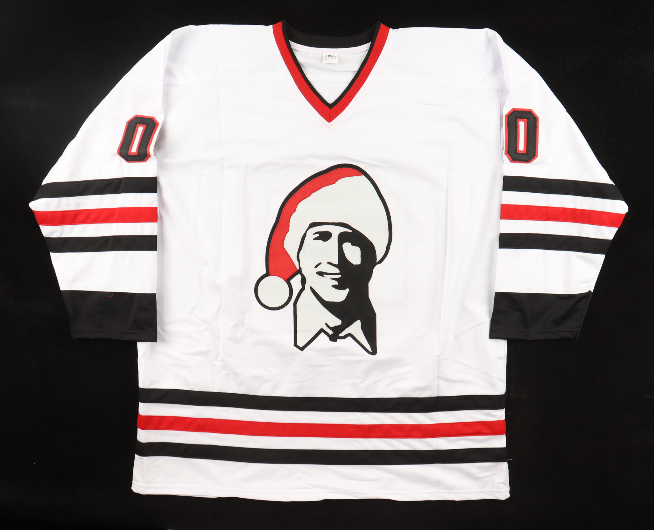 Custom jersey with everything sewn on, size XL. Hand-signed by Chevy Chase (Clark Griswold). Please note, there is red staining on the sleeves.
