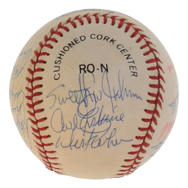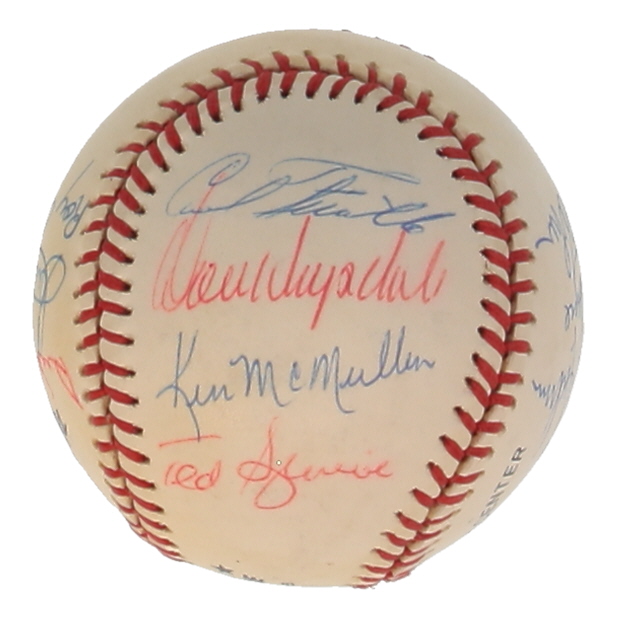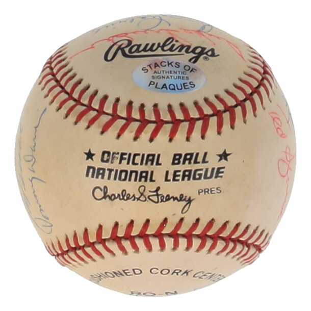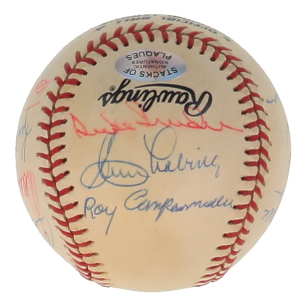 Rawlings Official National League baseball. Hand-signed by Duke Snider, Preacher Roe, Don Drysdale, Carl Furillo, Carl Erskine, Johnny Podres, Tommy Davis, Ted Sizemore, Wes Parker, Clem Labine, Ron Perranoski, Sweet Lou Johnson, Ralph Branca, Ken McMullen, and Roy Campanella (Clubhouse Version). Please note, the baseball is naturally toned.